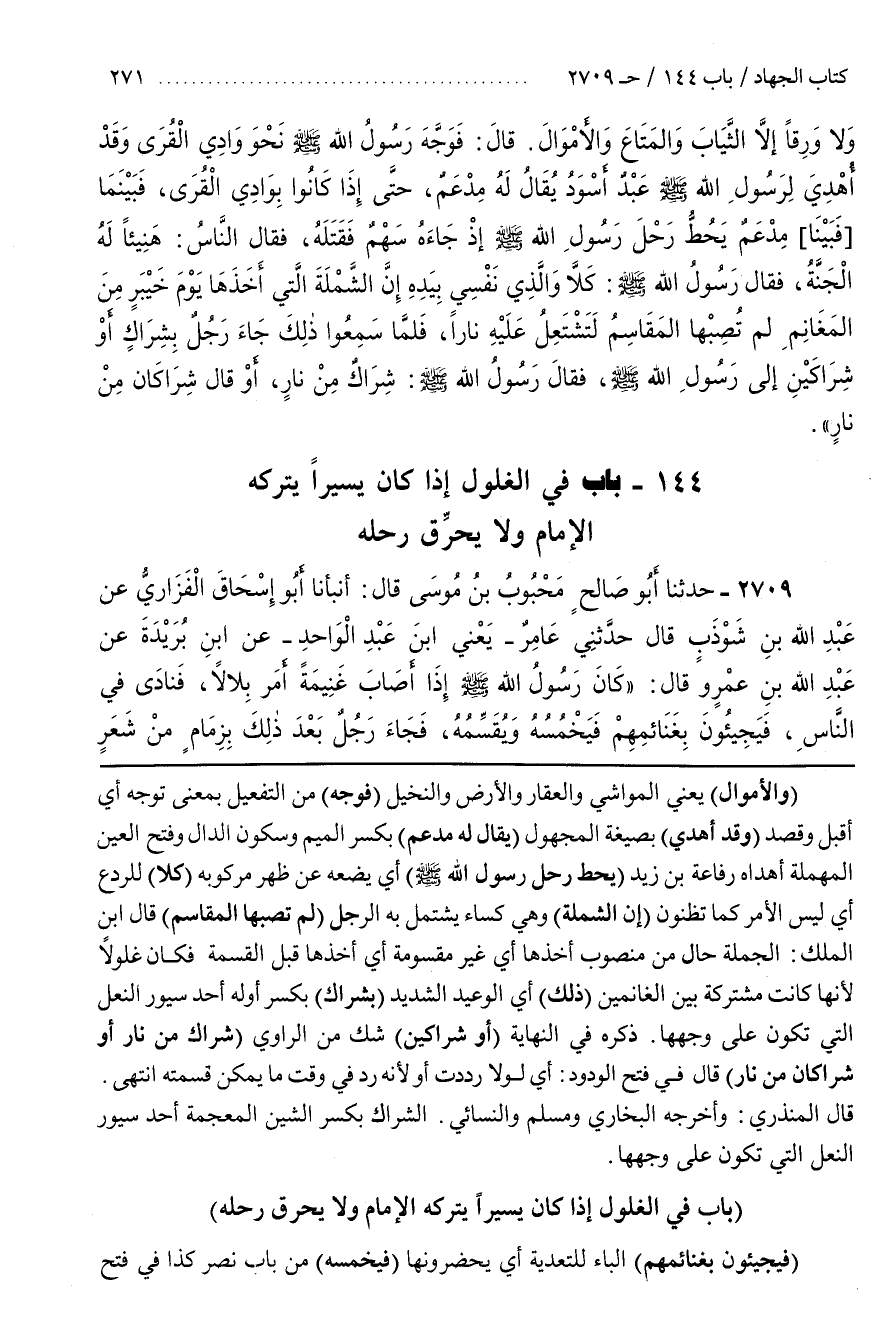 [2711] (وَالْأَمْوَالَ) يَعْنِي الْمَوَاشِيَ وَالْعَقَارَ وَالْأَرْضَ وَالنَّخِيلَ (فَوَجَّهَ) مِنَ التَّفْعِيلِ بِمَعْنَى تَوَجَّهَ أَيْ أَقْبَلَ وَقَصَدَ (وَقَدْ أُهْدِيَ) بِصِيغَةِ الْمَجْهُولِ (يُقَالُ لَهُ مِدْعَمٌ) بِكَسْرِ الْمِيمِ وَسُكُونِ الدَّالِ وَفَتْحِ الْعَيْنِ الْمُهْمَلَةِ أَهْدَاهُ رِفَاعَةُ بْنُ زَيْدٍ (يَحُطُّ رَحْلَ رَسُولِ اللَّهِ صَلَّى اللَّهُ عَلَيْهِ وَسَلَّمَ) أَيْ يَضَعُهُ عَنْ ظَهْرِ مَرْكُوبِهِ (كَلَّا) لِلرَّدْعِ أَيْ لَيْسَ الْأَمْرُ كَمَا تَظُنُّونَ (إِنَّ الشَّمْلَةَ) وَهِيَ كِسَاءٌ يَشْتَمِلُ بِهِ الرَّجُلُ (لَمْ تُصِبْهَا الْمَقَاسِمُ) قَالَ بن الْمَلَكِ الْجُمْلَةُ حَالٌ مِنْ مَنْصُوبِ أَخَذَهَا أَيْ غَيْرُ مَقْسُومَةٍ أَيْ أَخَذَهَا قَبْلَ الْقِسْمَةِ فَكَانَ غُلُولًا لِأَنَّهَا كَانَتْ مُشْتَرَكَةً بَيْنَ الْغَانِمِينَ (ذَلِكَ) أَيِ الْوَعِيدَ الشَّدِيدَ (بِشِرَاكٍ) بِكَسْرِ أَوَّلِهِ أَحَدُ سُيُورِ النَّعْلِ الَّتِي تَكُونُ عَلَى وَجْهِهَا