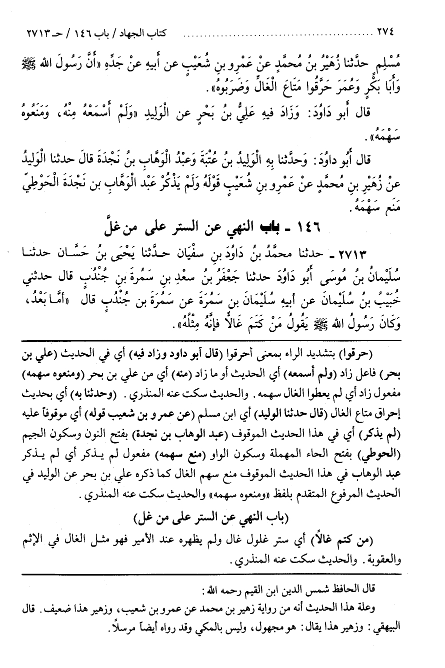 [2715] (حَرَّقُوا) بِتَشْدِيدِ الرَّاءِ بِمَعْنَى أَحْرَقُوا (قَالَ أَبُو دَاوُدَ وَزَادَ فِيهِ) أَيْ فِي الْحَدِيثِ (عَلِيُّ بْنُ بَحْرٍ) فَاعِلُ زَادَ (وَلَمْ أَسْمَعْهُ) أَيِ الحديث أو مازاد (مِنْهُ) أَيْ مِنْ عَلِيِّ بْنِ بَحْرٍ (وَمَنَعُوهُ سَهْمُهُ) مَفْعُولُ زَادَ أَيْ لَمْ يُعْطُوا الْغَالَّ سَهْمَهُ