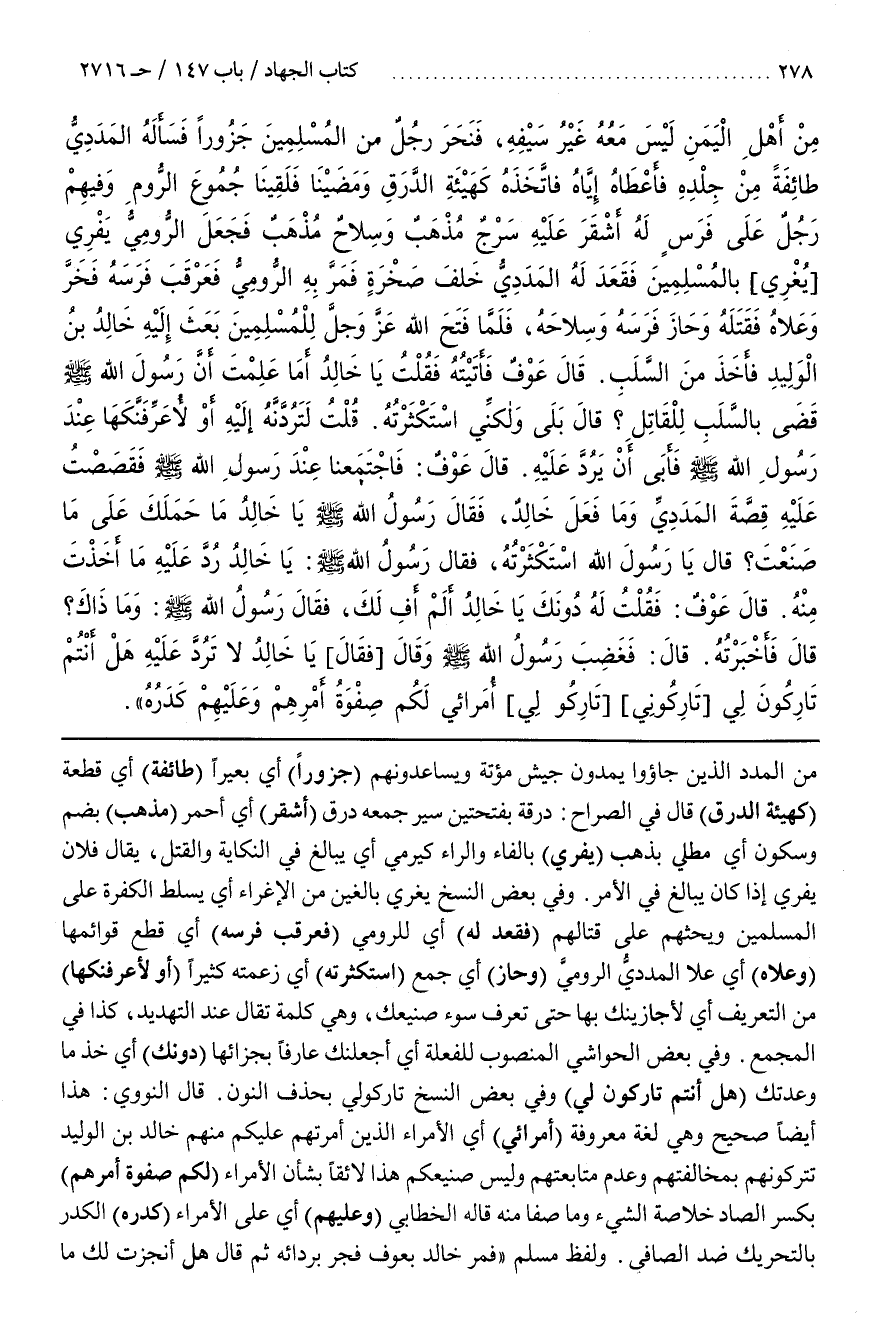 وَلَفْظُ مُسْلِمٍ فَمَرَّ خَالِدٌ بِعَوْفٍ فَجَرَّ بِرِدَائِهِ ثُمَّ قَالَ هَلْ أَنْجَزْتُ لَكَ ما