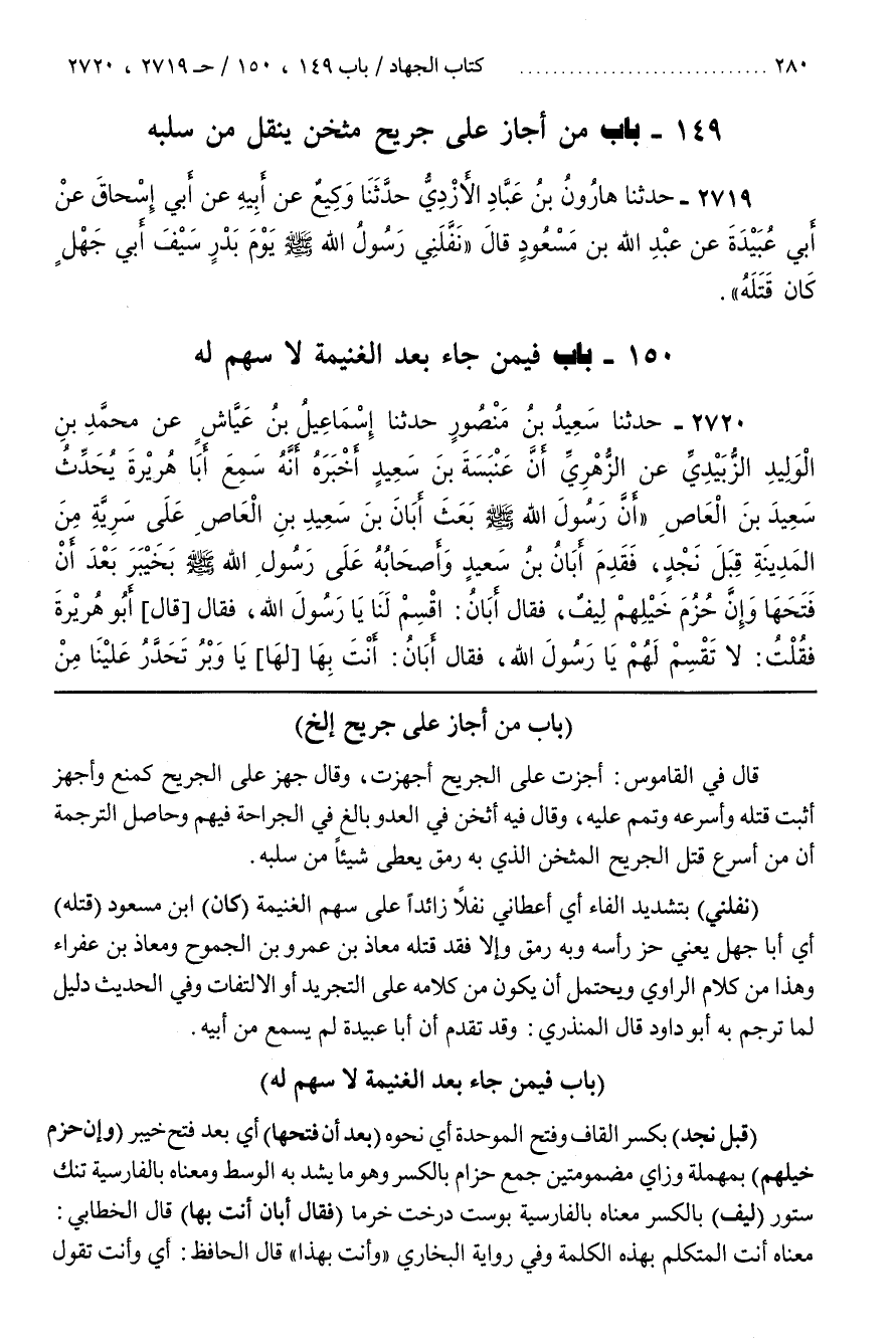 [2723] (قِبَلَ نَجْدٍ) بِكَسْرِ الْقَافِ وَفَتْحِ الْمُوَحَّدَةِ أَيْ نَحْوَهُ (بَعْدَ أَنْ فَتَحَهَا) أَيْ بَعْدَ فَتْحِ خَيْبَرَ (وَإِنَّ حُزُمَ خَيْلِهِمْ) بِمُهْمَلَةٍ وَزَايٍ مَضْمُومَتَيْنِ جَمْعُ حِزَامٍ بِالْكَسْرِ وَهُوَ مَا يُشَدُّ بِهِ الْوَسَطُ وَمَعْنَاهُ بِالْفَارِسِيَّةِ تنك ستور (لِيفٌ) بِالْكَسْرِ مَعْنَاهُ بِالْفَارِسِيَّةِ بوست درخت خرما (فَقَالَ أَبَانُ أَنْتَ بِهَا) قَالَ الْخَطَّابِيُّ مَعْنَاهُ أَنْتَ الْمُتَكَلِّمُ بِهَذِهِ الْكَلِمَةِ وَفِي رِوَايَةِ الْبُخَارِيِّ وَأَنْتَ بِهَذَا قَالَ الْحَافِظُ أَيْ وَأَنْتَ تَقُولُ بِهَذَا أَوْ أَنْتَ