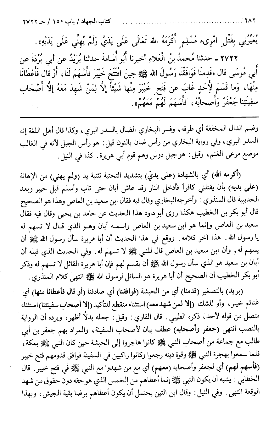 [2725] (بُرَيْدٌ) بِالتَّصْغِيرِ (قَدِمْنَا) أَيْ مِنَ الْحَبَشَةِ (فَوَافَقْنَا) أَيْ صَادَفْنَا (أَوْ قَالَ فَأَعْطَانَا مِنْهَا) أَيْ غَنَائِمِ خَيْبَرَ وَأَوْ لِلشَّكِّ (إِلَّا لِمَنْ شَهِدَ مَعَهُ) اسْتِثْنَاءٌ مُنْقَطِعٌ لِلتَّأْكِيدِ (إِلَّا أَصْحَابَ سَفِينَتِنَا) اسْتِثْنَاءٌ مُتَّصِلٌ مِنْ قَوْلِهِ لأحد ذكره الطيبي