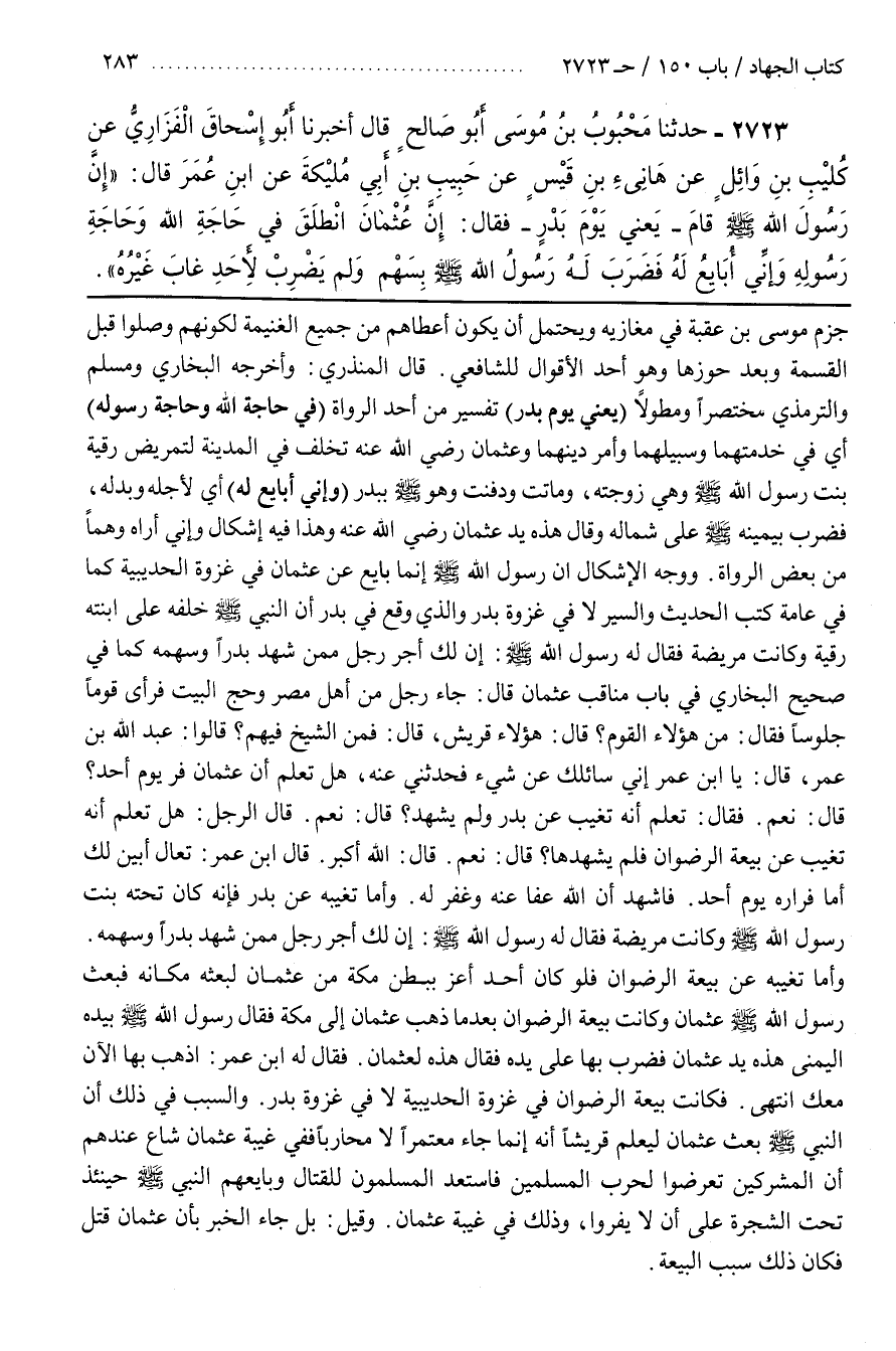 وَوَجْهُ الْإِشْكَالِ أَنَّ رسول الله إِنَّمَا بَايَعَ عَنْ عُثْمَانَ فِي غَزْوَةِ الْحُدَيْبِيَةِ كَمَا فِي عَامَّةِ كُتُبِ الْحَدِيثِ وَالسِّيَرِ لَا فِي غَزْوَةِ بَدْرٍ وَالَّذِي وَقَعَ فِي بَدْرٍ أن النبي خَلَّفَهُ عَلَى ابْنَتِهِ رُقَيَّةَ وَكَانَتْ مَرِيضَةً فَقَالَ له رسول الله إِنَّ لَكَ أَجْرَ رَجُلٍ مِمَّنْ شَهِدَ بَدْرًا وَسَهْمَهُ كَمَا فِي صَحِيحِ الْبُخَارِيِّ فِي بَابِ مَنَاقِبِ عُثْمَانَ قَالَ جَاءَ رَجُلٌ مِنْ أَهْلِ مِصْرَ وَحَجَّ الْبَيْتَ فَرَأَى قَوْمًا جُلُوسًا فَقَالَ مَنْ هَؤُلَاءِ الْقَوْمُ قَالَ هَؤُلَاءِ قُرَيْشٌ قَالَ فَمَنِ الشَّيْخُ فِيهِمْ قَالُوا عَبْدُ اللَّهِ بْنُ عمر قال يا بن عُمَرَ إِنِّي سَائِلُكَ عَنْ شَيْءٍ فَحَدِّثْنِي عَنْهُ هَلْ تَعْلَمُ أَنَّ عُثْمَانَ فَرَّ يَوْمَ أُحُدٍ قَالَ نَعَمْ