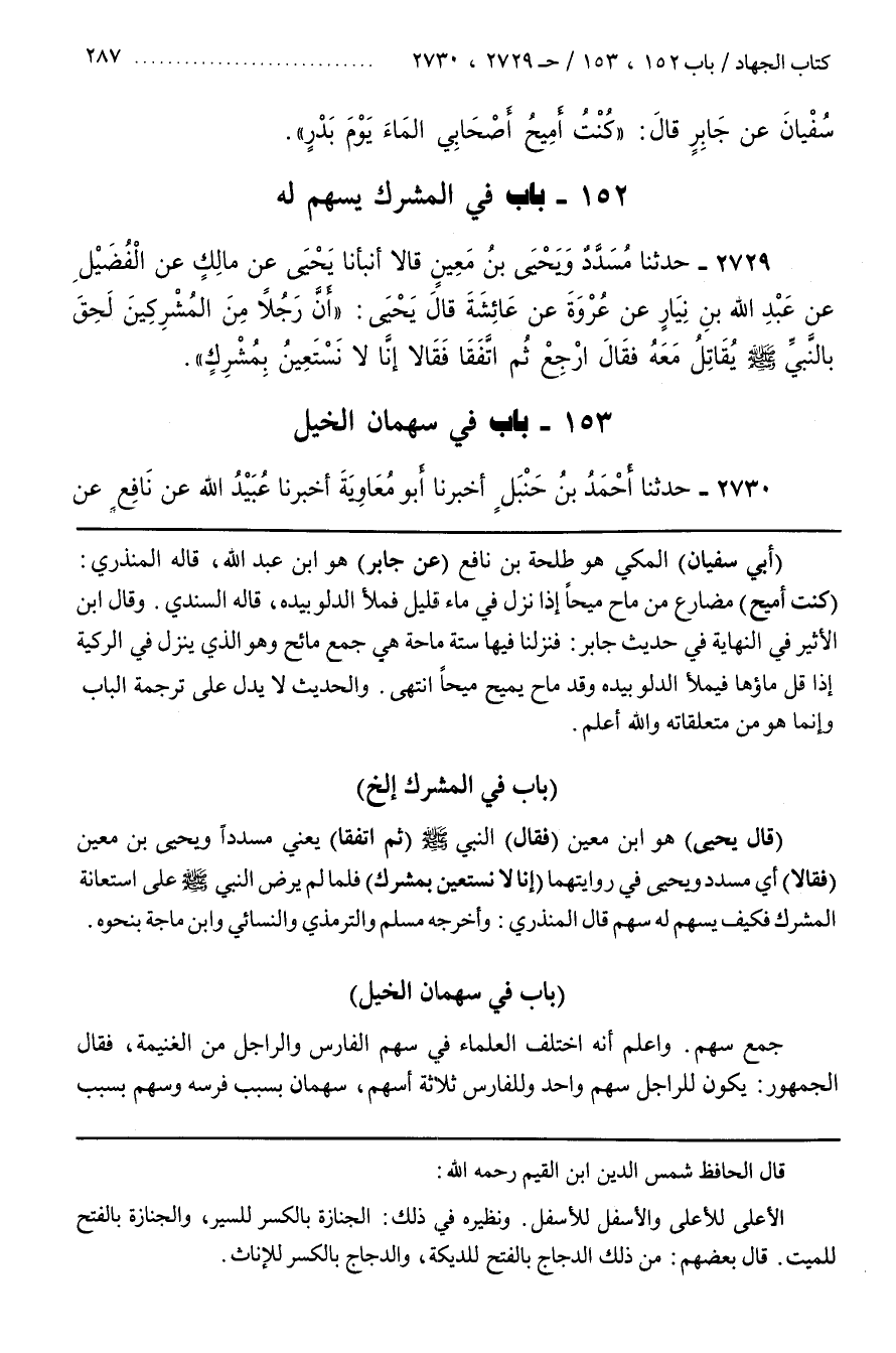 [2732] إلخ (قال يحيى) هو بن مَعِينٍ (فَقَالَ) النَّبِيُّ صَلَّى اللَّهُ عَلَيْهِ وَسَلَّمَ (ثُمَّ اتَّفَقَا) يَعْنِي مُسَدِّدًا وَيَحْيَى بْنَ مَعِينٍ (فَقَالَا) أَيْ مُسَدِّدٌ وَيَحْيَى فِي رِوَايَتِهِمَا (إِنَّا لَا نَسْتَعِينُ بِمُشْرِكٍ فَلَمَّا لَمْ يَرْضَ النَّبِيُّ صَلَّى اللَّهُ عَلَيْهِ وَسَلَّمَ عَلَى اسْتِعَانَةِ الْمُشْرِكِ فَكَيْفَ يُسْهَمُ لَهُ سَهْمٌ) قَالَ الْمُنْذِرِيُّ وَأَخْرَجَهُ مسلم والترمذي والنسائي وبن مَاجَهْ بِنَحْوِهِ
