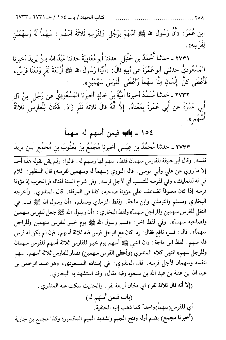 وَلَفْظُ التِّرْمِذِيِّ وَمُسْلِمٍ أَنَّ رَسُولَ اللَّهِ صَلَّى اللَّهُ عَلَيْهِ وَسَلَّمَ قَسَمَ فِي النَّفْلِ لِلْفَرَسِ سَهْمَيْنِ وَلِلرَّاجِلِ سَهْمًا وَلَفْظُ الْبُخَارِيِّ أَنَّ رَسُولَ اللَّهِ صَلَّى اللَّهُ عَلَيْهِ وَسَلَّمَ جَعَلَ لِلْفَرَسِ سَهْمَيْنِ وَلِصَاحِبِهِ سَهْمًا وَفِي لَفْظٍ آخَرَ قَسَمَ رَسُولِ اللَّهِ صَلَّى اللَّهُ عَلَيْهِ وَسَلَّمَ يَوْمَ خَيْبَرَ لِلْفَرَسِ سَهْمَيْنِ وَلِلرَّاجِلِ سَهْمًا قَالَ فَسَّرَهُ نَافِعٌ فَقَالَ إِذَا كَانَ مَعَ الرَّجُلِ فَرَسٌ فَلَهُ ثَلَاثَةٌ أَسْهُمٍ فَإِنْ لَمْ يَكُنْ له فرس فله سهم