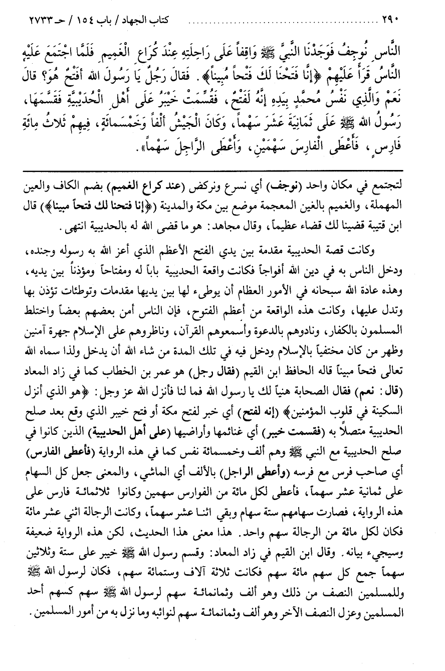 وَكَانَتْ قِصَّةُ الْحُدَيْبِيَةِ مُقَدَّمَةً بَيْنَ يَدَيِ الْفَتْحِ الْأَعْظَمِ الَّذِي أَعَزَّ اللَّهُ بِهِ رَسُولَهُ وَجُنْدَهُ وَدَخَلَ النَّاسُ بِهِ فِي دِينِ اللَّهِ أَفْوَاجًا فَكَانَتْ وَاقِعَةُ الْحُدَيْبِيَةِ بَابًا وَمِفْتَاحًا وَمُؤَذِّنًا بَيْنَ يَدَيْهِ وَهَذِهِ عَادَةُ اللَّهِ سُبْحَانَهُ فِي الْأُمُورِ الْعِظَامِ أَنْ يُوَطِّئَ لَهَا بَيْنَ يَدَيْهَا مُقَدِّمَاتٍ وَتَوْطِئَاتٍ تُؤْذِنُ بِهَا وَتَدُلُّ عَلَيْهَا وَكَانَتْ هَذِهِ الْوَاقِعَةُ مِنْ أَعْظَمِ الْفُتُوحِ فَإِنَّ النَّاسَ أَمِنَ بَعْضُهُمْ بَعْضًا وَاخْتَلَطَ الْمُسْلِمُونَ بِالْكُفَّارِ وَنَادَوْهُمْ بِالدَّعْوَةِ وَأَسْمَعُوهُمُ الْقُرْآنَ وَنَاظَرُوهُمْ عَلَى الْإِسْلَامِ جَهْرَةً آمِنِينَ وَظَهَرَ مَنْ كَانَ مُخْتَفِيًا بِالْإِسْلَامِ وَدَخَلَ فِيهِ فِي تِلْكَ الْمُدَّةِ مَنْ شَاءَ اللَّهُ أَنْ يَدْخُلَ وَلِذَا سَمَّاهُ اللَّهُ تَعَالَى فَتْحًا مُبِينًا قاله الحافظ بن الْقَيِّمِ (فَقَالَ رَجُلٌ) هُوَ عُمَرُ بْنُ الْخَطَّابِ كَمَا فِي زَادِ الْمَعَادِ (قَالَ نَعَمْ) فَقَالَ الصحابة هنيالك يارسول الله فما لنا فأنزل الله عزوجل هُوَ الَّذِي أَنْزَلَ السَّكِينَةَ فِي قُلُوبِ الْمُؤْمِنِينَ (إِنَّهُ لَفَتْحٌ) أَيْ خَبَرٌ لِفَتْحِ مَكَّةَ أَوْ فَتْحِ خَيْبَرَ الَّذِي وَقَعَ بَعْدَ صُلْحِ الْحُدَيْبِيَةِ مُتَّصِلًا بِهِ (فَقُسِّمَتْ خَيْبَرُ) أَيْ غَنَائِمُهَا وَأَرَاضِيهَا (عَلَى أَهْلِ الْحُدَيْبِيَةِ) الَّذِينَ كَانُوا فِي صُلْحِ الْحُدَيْبِيَةِ مَعَ النَّبِيِّ صَلَّى اللَّهُ عَلَيْهِ وَسَلَّمَ وَهُمْ ألف وخمس مائة نَفْسٍ كَمَا فِي هَذِهِ الرِّوَايَةِ (فَأَعْطَى الْفَارِسَ) أَيْ صَاحِبَ فَرَسٍ مَعَ فَرَسِهِ (وَأَعْطَى الرَّاجِلَ) بِالْأَلِفِ أَيِ الْمَاشِيَ وَالْمَعْنَى جَعَلَ كُلَّ السِّهَامِ عَلَى ثَمَانِيَةَ عَشَرَ سَهْمًا فَأَعْطَى لِكُلِّ مِائَةٍ من الفوارس سهمين وكان ثلاث مائة فَارِسٍ عَلَى هَذِهِ الرِّوَايَةِ فَصَارَتْ سِهَامُهُمْ سِتَّةَ سهام وبقي اثني عَشَرَ سَهْمًا وَكَانَتِ الرَّجَّالَةُ اثْنَيْ عَشَرَ مِائَةً فَكَانَ لِكُلِّ مِائَةٍ مِنَ الرَّجَّالَةِ سَهْمٌ وَاحِدٌ