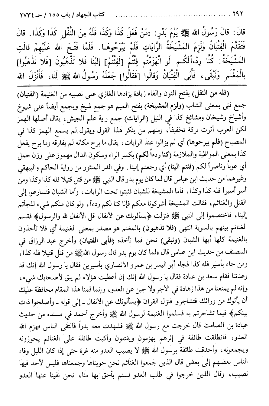 وَفِي الدُّرِّ الْمَنْثُورِ مِنْ رواية الحاكم والبيهقي وغيرهما من حديث بن عَبَّاسٍ قَالَ لَمَّا كَانَ يَوْمُ بَدْرٍ قَالَ النَّبِيُّ صَلَّى اللَّهُ عَلَيْهِ وَسَلَّمَ مَنْ قَتَلَ قَتِيلًا فَلَهُ كَذَا وَكَذَا وَمَنْ أَسَرَ أَسِيرًا فَلَهُ كَذَا وَكَذَا فَأَمَّا الْمَشْيَخَةُ فَثَبَتُوا تَحْتَ الرَّايَاتِ وَأَمَّا الشُّبَّانُ فَتَسَارَعُوا إِلَى الْقَتْلِ وَالْغَنَائِمِ فَقَالَتِ الْمَشْيَخَةُ لِلشُّبَّانِ أَشْرِكُونَا مَعَكُمْ فَإِنَّا كُنَّا لَكُمْ رِدْءًا وَلَوْ كَانَ مِنْكُمْ شَيْءٌ لَلَجَأْتُمْ إِلَيْنَا فَاخْتَصَمُوا إِلَى النَّبِيِّ صَلَّى اللَّهُ عَلَيْهِ وَسَلَّمَ فنزلت يسئلونك عن الأنفال قل الأنفال لله والرسول فَقَسَمَ الْغَنَائِمَ بَيْنَهُمْ بِالسَّوِيَّةِ انْتَهَى (فَلَا تَذْهَبُونَ) بِالْمَغْنَمِ هُوَ مَصْدَرٌ بِمَعْنَى الْغَنِيمَةِ أَيْ فَلَا تَأْخُذُونَ بِالْغَنِيمَةِ كُلِّهَا أَيُّهَا الشُّبَّانُ (وَنَبْقَى) نَحْنُ فَمَا نَأْخُذُهُ (فَأَبَى الْفِتْيَانُ) وَأَخْرَجَ عَبْدُ الرَّزَّاقِ في المصنف من حديث بن عَبَّاسٍ قَالَ لَمَّا كَانَ يَوْمُ بَدْرٍ قَالَ رَسُولُ اللَّهِ صَلَّى اللَّهُ عَلَيْهِ وَسَلَّمَ من قَتَلَ قَتِيلًا فَلَهُ كَذَا وَمَنْ جَاءَ بِأَسِيرٍ فَلَهُ كَذَا فَجَاءَ أَبُو الْيَسَرِ بْنُ عَمْرٍو الأنصاري بأسيرين فقال يارسول اللَّهِ إِنَّكَ قَدْ وَعَدْتَنَا فَقَامَ سَعْدُ بْنُ عبادة فقال يارسول اللَّهِ إِنَّكَ إِنْ أَعْطَيْتَ هَؤُلَاءِ لَمْ يَبْقَ لِأَصْحَابِكِ شَيْءٌ وَإِنَّهُ لَمْ يَمْنَعْنَا مِنْ هَذَا زَهَادَةٌ فِي الْأَجْرِ وَلَا جُبْنٌ عَنِ الْعَدُوِّ وَإِنَّمَا قُمْنَا هَذَا الْمَقَامَ مُحَافَظَةً عَلَيْكَ أَنْ يَأْتُوكَ مِنْ وَرَائِكِ فَتَشَاجَرُوا فَنَزَلَ الْقُرْآنُ يَسْأَلُونَكَ عن الأنفال إلى قوله وأصلحوا ذات بينكم فِيمَا تَشَاجَرْتُمْ بِهِ فَسَلِّمُوا الْغَنِيمَةَ لِرَسُولِ اللَّهِ صَلَّى اللَّهُ عَلَيْهِ وَسَلَّمَ وَأَخْرَجَ أَحْمَدُ فِي مُسْنَدِهِ مِنْ حَدِيثِ عُبَادَةَ بْنِ الصَّامِتِ قَالَ خَرَجْتُ مَعَ رَسُولِ اللَّهِ صَلَّى اللَّهُ عَلَيْهِ وَسَلَّمَ فَشَهِدْتُ مَعَهُ بَدْرًا فَالْتَقَى النَّاسُ فَهَزَمَ اللَّهُ الْعَدُوَّ فَانْطَلَقَتْ طَائِفَةٌ فِي إِثْرِهِمْ يَهْزِمُونَ وَيَقْتُلُونَ وَأَكَبَّتْ طَائِفَةٌ عَلَى الْغَنَائِمِ يَحُوزُونَهُ وَيَجْمَعُونَهُ وَأَحْدَقَتْ طَائِفَةٌ بِرَسُولِ اللَّهِ صَلَّى اللَّهُ عَلَيْهِ وَسَلَّمَ لَا يُصِيبُ الْعَدُوُّ مِنْهُ غِرَّةً حَتَّى إِذَا كَانَ اللَّيْلُ وَفَاءَ النَّاسُ بَعْضُهُمْ إِلَى بَعْضٍ قَالَ الَّذِينَ جَمَعُوا الْغَنَائِمَ نَحْنُ حَوَيْنَاهَا وَجَمَعْنَاهَا فَلَيْسَ لِأَحَدٍ فِيهَا نَصِيبٌ وَقَالَ الَّذِينَ خَرَجُوا فِي طَلَبِ الْعَدُوِّ لَسْتُمْ بِأَحَقَّ بِهَا مِنَّا نَحْنُ نَفَيْنَا عَنْهَا الْعَدُوَّ