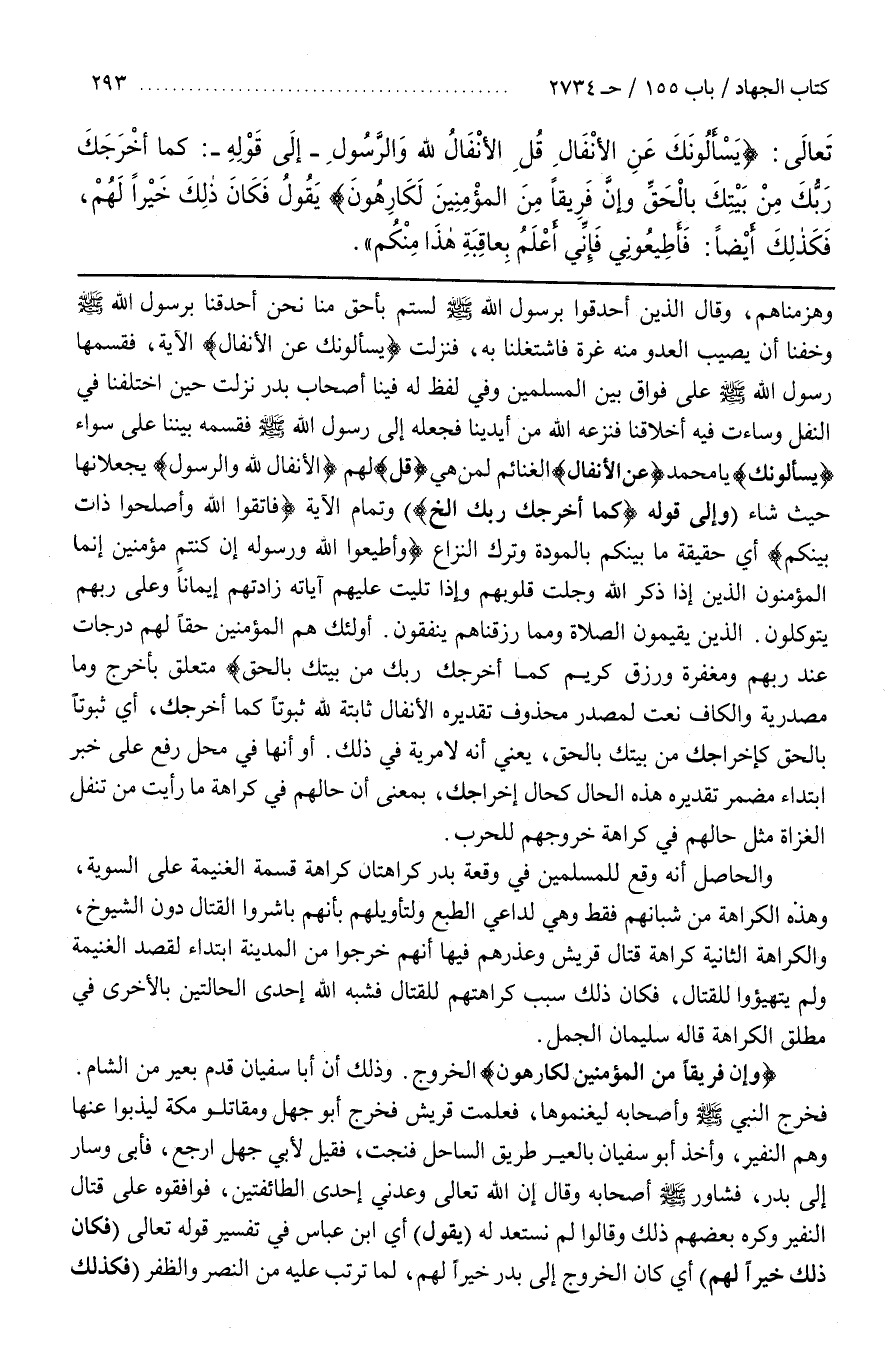 وَذَلِكَ أَنَّ أَبَا سُفْيَانَ قَدِمَ بِعِيرٍ مِنَ الشَّامِ فَخَرَجَ النَّبِيُّ صَلَّى اللَّهُ عَلَيْهِ وَسَلَّمَ وَأَصْحَابُهُ لِيَغْنَمُوهَا فَعَلِمَتْ قُرَيْشٌ فَخَرَجَ أَبُو جَهْلٍ وَمُقَاتِلُو مَكَّةَ لِيَذُبُّوا عَنْهَا وَهُمُ النَّفِيرُ وَأَخَذَ أَبُو سُفْيَانَ بِالْعِيرِ طَرِيقَ السَّاحِلِ فَنَجَتْ فَقِيلَ لِأَبِي جَهْلٍ ارْجِعْ فَأَبَى وَسَارَ إِلَى بَدْرٍ فَشَاوَرَ صَلَّى اللَّهُ عَلَيْهِ وَسَلَّمَ أَصْحَابَهَ وَقَالَ إِنَّ اللَّهَ تَعَالَى وَعَدَنِي إِحْدَى الطَّائِفَتَيْنِ فَوَافَقُوهُ عَلَى قِتَالِ النَّفِيرِ وَكَرِهَ بَعْضُهُمْ ذَلِكَ وقالوا لم نستعد له (يقول) أي بن عَبَّاسٍ فِي تَفْسِيرِ قَوْلِهِ تَعَالَى (فَكَانَ ذَلِكَ خَيْرًا لَهُمْ) أَيْ كَانَ الْخُرُوجُ إِلَى بَدْرٍ خَيْرًا لَهُمْ لِمَا تَرَتَّبَ عَلَيْهِ مِنَ النَّصْرِ والظفر (فكذلك