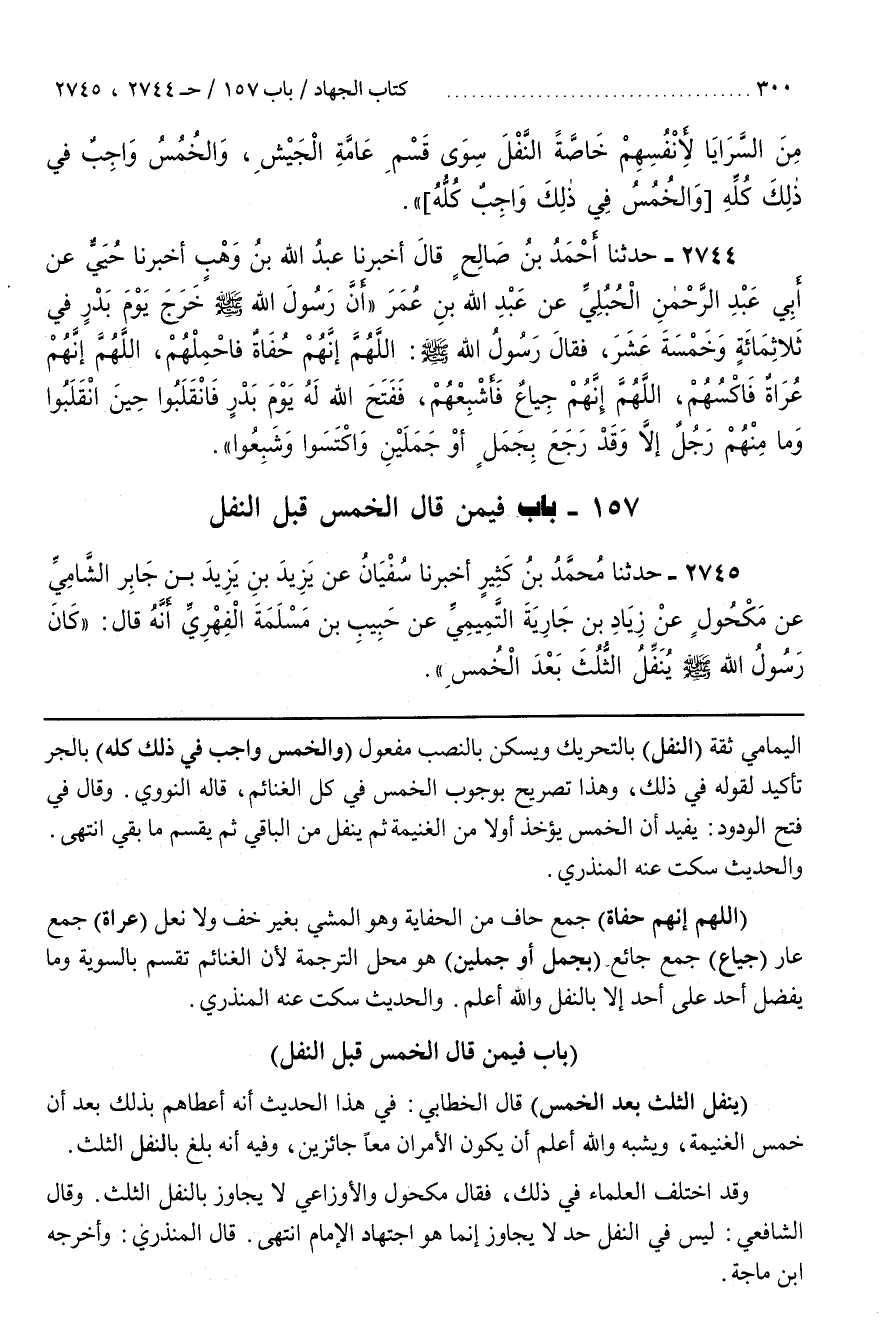 [2748] (يُنَفِّلُ الثُّلُثَ بَعْدَ الْخُمْسِ) قَالَ الْخَطَّابِيُّ فِي هَذَا الْحَدِيثِ أَنَّهُ أَعْطَاهُمْ ذَلِكَ بَعْدَ أَنْ خَمَّسَ الْغَنِيمَةَ وَيُشْبِهُ وَاللَّهُ أَعْلَمُ أَنْ يَكُونَ الْأَمْرَانِ مَعًا جَائِزَيْنِ وَفِيهِ أَنَّهُ بَلَغَ بِالنَّفْلِ الثُّلُثَ