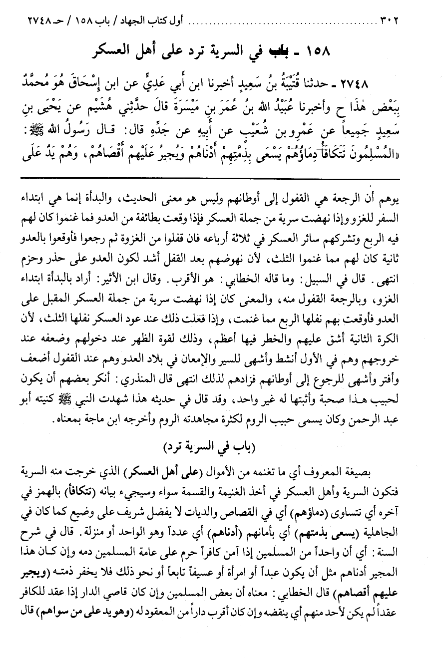 (تَتَكَافَأُ) بِالْهَمْزِ فِي آخِرِهِ أَيْ تَتَسَاوَى (دِمَاؤُهُمْ) أَيْ فِي الْقِصَاصِ وَالدِّيَاتِ لَا يُفَضَّلُ شَرِيفٌ عَلَى وَضِيعٍ كَمَا كَانَ فِي الْجَاهِلِيَّةِ (يَسْعَى بِذِمَّتِهِمْ) أَيْ بِأَمَانِهِمْ (أَدْنَاهُمْ) أَيْ عَدَدًا وَهُوَ الْوَاحِدُ أَوْ مَنْزِلَةً