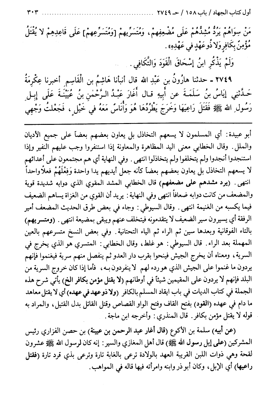 قَالَ السُّيُوطِيُّ هُوَ غَلَطٌ وَقَالَ الْخَطَّابِيُّ الْمُتَسَرِّي هُوَ الَّذِي يَخْرُجُ فِي السَّرِيَّةِ وَمَعْنَاهُ أَنْ يَخْرُجَ الْجَيْشُ فَيَنْحُوَا بِقُرْبِ دَارِ الْعَدُوِّ ثُمَّ يَنْفَصِلُ مِنْهُمْ سَرِيَّةٌ فَيَغْنَمُوا فَإِنَّهُمْ يَرُدُّونَ مَا غَنِمُوا عَلَى الْجَيْشِ الَّذِي هُوَ رِدْءٌ لَهُمْ لَا يَنْفَرِدُونَ بِهِ فَأَمَّا إِذَا كَانَ خُرُوجُ السَّرِيَّةِ مِنَ الْبَلَدِ فَإِنَّهُمْ لَا يَرُدُّونَ عَلَى الْمُقِيمِينَ شَيْئًا فِي أَوْطَانِهِمْ (لَا يُقْتَلُ مُؤْمِنٌ بِكَافِرٍ إِلَخْ) يَأْتِي شَرْحُ هَذِهِ الْجُمْلَةِ فِي كِتَابِ الدِّيَاتِ فِي بَابِ إِيقَادِ المسلم بالكافر (ولاذو عَهْدٍ فِي عَهْدِهِ) أَيْ لَا يُقْتَلُ مَعَاهَدٌ مَا دَامَ فِي عَهْدِهِ (الْقَوَدَ) بِفَتْحِ الْقَافِ وَفَتْحِ الْوَاوِ الْقِصَاصَ وَقَتْلَ الْقَاتِلِ بَدَلَ الْقَتِيلِ وَالْمُرَادُ بِهِ قَوْلُهُ لَا يُقْتَلُ مُؤْمِنٌ بِكَافِرٍ