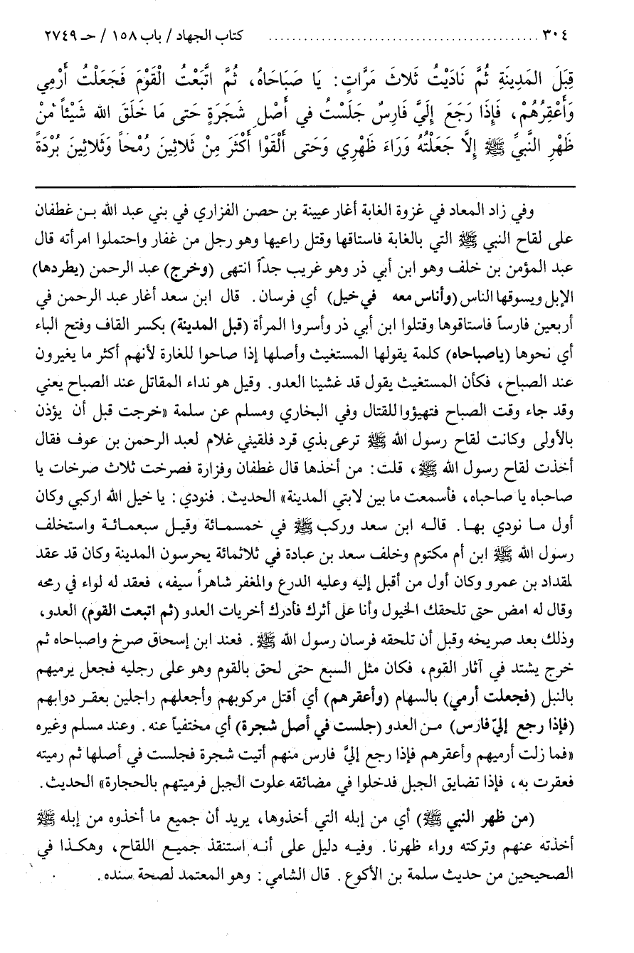 فعند بن إِسْحَاقَ صَرَخَ وَاصَبَاحَاهْ ثُمَّ خَرَجَ يَشْتَدُّ فِي آثَارِ الْقَوْمِ فَكَانَ مِثْلَ السَّبُعِ حَتَّى لَحِقَ بِالْقَوْمِ وَهُوَ عَلَى رِجْلَيْهِ فَجَعَلَ يَرْمِيهِمْ بِالنَّبْلِ (فَجَعَلْتُ أَرْمِي) بِالسِّهَامِ (وَأَعْقِرُهُمْ) أَيْ أَقْتُلُ مَرْكُوبُهُمْ وَأَجْعَلُهُمْ رَاجِلِينَ بِعُقْرِ دَوَابِّهِمْ (فَإِذَا رَجَعَ إِلَيَّ فَارِسٌ) مِنَ الْعَدُوِّ (جَلَسْتُ فِي أَصْلِ شَجَرَةٍ) أَيْ مُخْتَفِيًا عَنْهُ