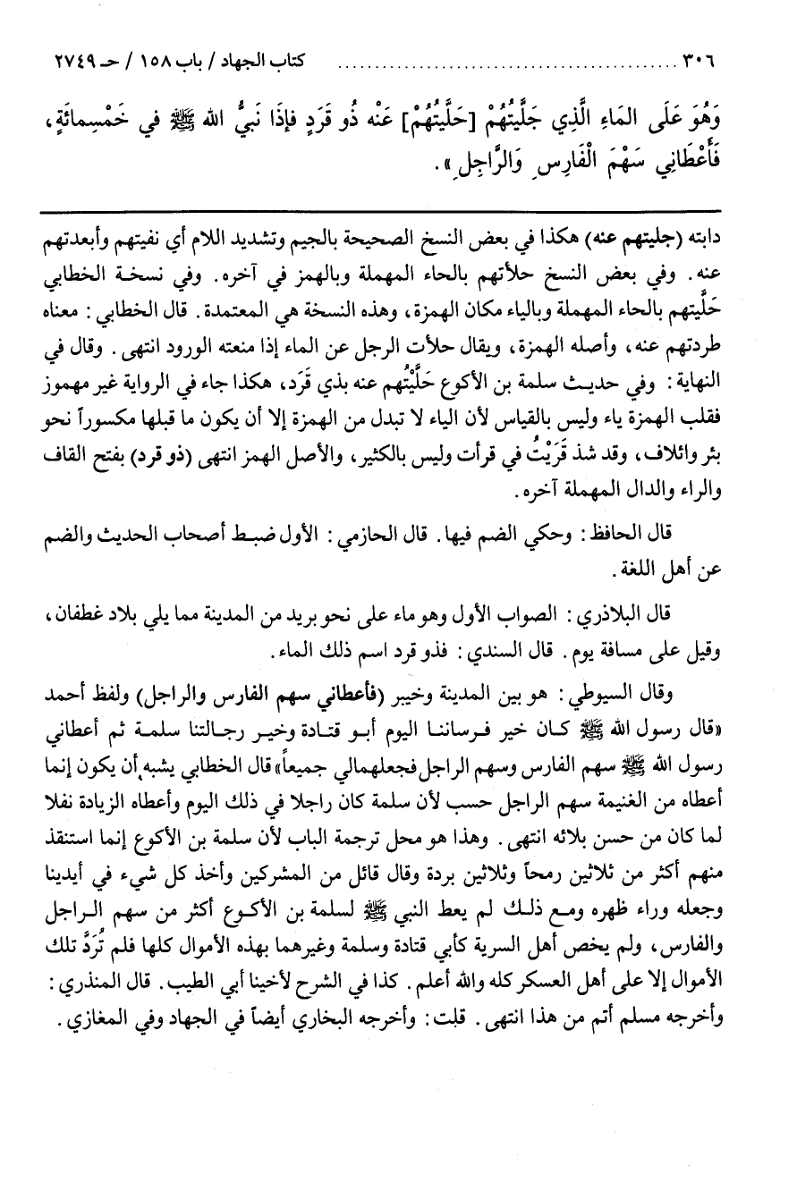وَقَالَ السُّيُوطِيُّ هُوَ بَيْنَ الْمَدِينَةِ وَخَيْبَرَ (فَأَعْطَانِي سَهْمَ الْفَارِسِ وَالرَّاجِلِ) وَلَفْظُ أَحْمَدَ قَالَ رَسُولُ اللَّهِ صَلَّى اللَّهُ عَلَيْهِ وَسَلَّمَ كَانَ خَيْرُ فُرْسَانِنَا الْيَوْمَ أَبُو قَتَادَةَ وَخَيْرُ رَجَّالَتِنَا سَلَمَةُ ثُمَّ أَعْطَانِي رَسُولُ اللَّهِ صَلَّى اللَّهُ عَلَيْهِ وَسَلَّمَ سَهْمَ الْفَارِسِ وَسَهْمَ الرَّاجِلِ فَجَعَلَهُمَا لِي جَمِيعًا قَالَ الْخَطَّابِيُّ يُشْبِهُ أَنْ يَكُونَ إِنَّمَا أَعْطَاهُ مِنَ الْغَنِيمَةِ سَهْمَ الرَّاجِلِ حَسْبُ لِأَنَّ سَلَمَةَ كَانَ رَاجِلًا فِي ذَلِكَ الْيَوْمِ وَأَعْطَاهُ الزِّيَادَةَ نَفْلًا لِمَا كَانَ مِنْ حُسْنِ بَلَائِهِ انْتَهَى