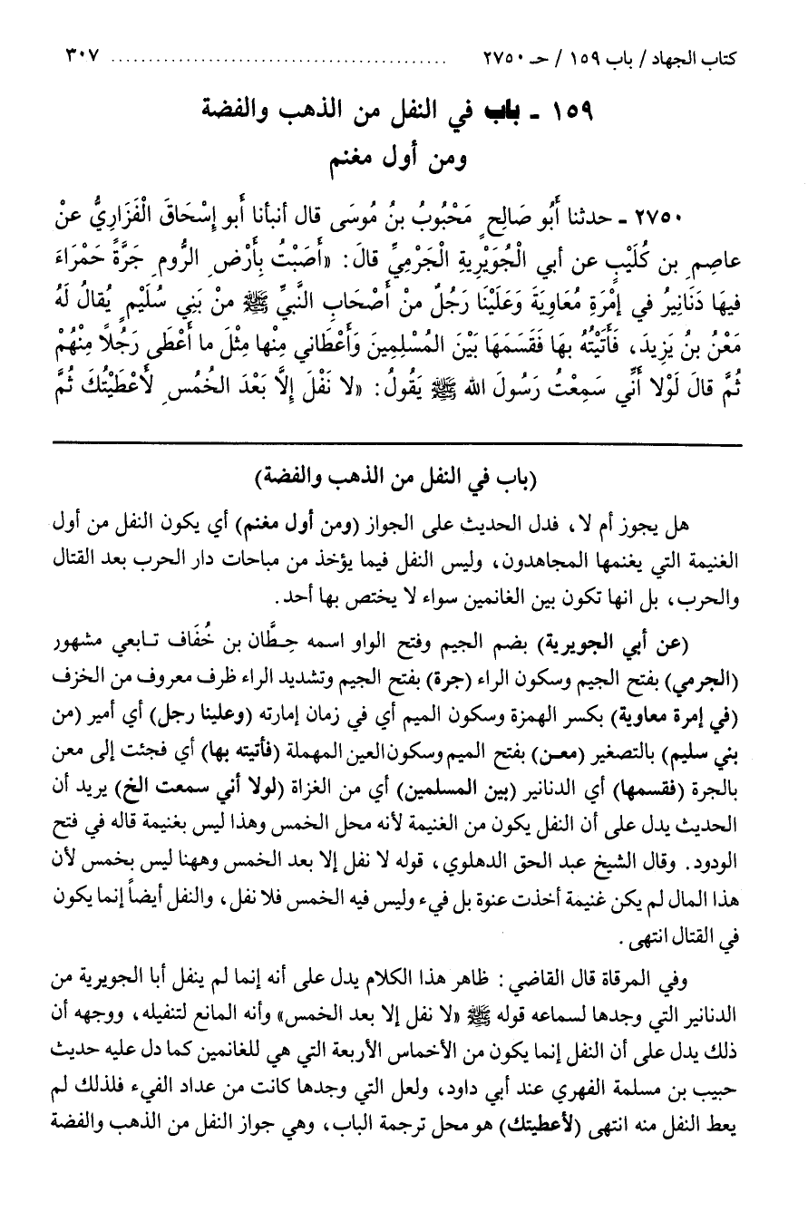 (عَنْ أَبِي الْجُوَيْرِيَةِ) بِضَمِّ الْجِيمِ وَفَتْحِ الْوَاوِ اسْمُهُ حِطَّانُ بْنُ خِفَافٍ تَابِعِيٌّ مَشْهُورٌ (الْجَرْمِيِّ) بِفَتْحِ الْجِيمِ وَسُكُونِ الرَّاءِ (جَرَّةً) بِفَتْحِ الْجِيمِ وَتَشْدِيدِ الرَّاءِ ظَرْفٌ مَعْرُوفٌ مِنَ الْخَزَفِ (فِي إِمْرَةِ مُعَاوِيَةَ) بِكَسْرِ الْهَمْزَةِ وَسُكُونِ الْمِيمِ أَيْ فِي زَمَانِ إِمَارَتِهِ (وَعَلَيْنَا رَجُلٌ) أَيْ أَمِيرٌ (مِنْ بَنِي سُلَيْمٍ) بِالتَّصْغِيرِ (مَعْنٌ) بِفَتْحِ الْمِيمِ وَسُكُونِ الْعَيْنِ الْمُهْمَلَةِ (فَأَتَيْتُهُ بِهَا) أَيْ فَجِئْتُ إِلَى مَعْنٍ بِالْجَرَّةِ (فَقَسَمَهَا) أَيِ الدَّنَانِيرَ (بَيْنَ الْمُسْلِمِينَ) أَيْ مِنَ الْغُزَاةِ (لَوْلَا أَنِّي سَمِعْتُ إِلَخْ) يُرِيدُ أَنَّ الْحَدِيثَ يَدُلُّ عَلَى أَنَّ النَّفْلَ يَكُونُ مِنَ الْغَنِيمَةِ لِأَنَّهُ مَحَلُّ الْخُمُسِ وَهَذَا لَيْسَ بِغَنِيمَةٍ قَالَهُ فِي فَتْحِ الْوَدُودِ