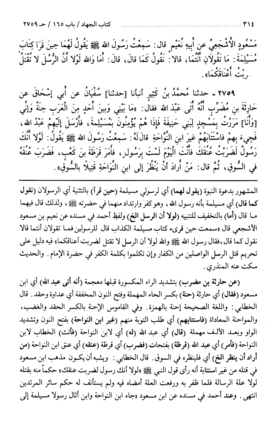 وَفِي الْقَامُوسِ الْإِحْنَةُ بِالْكَسْرِ الْحِقْدُ وَالْغَضَبُ وَالْمُوَاحَنَةُ الْمُعَادَاةُ (فاستتابهم) أي طلب التوبة منهم (غير بن النَّوَّاحَةِ) بِفَتْحِ النُّونِ وَتَشْدِيدِ الْوَاوِ بَعْدَ الْأَلِفِ مُهْمَلَةً (قَالَ) أَيْ عَبْدُ اللَّهِ (لَهُ) أَيْ لِابْنِ النَّوَّاحَةِ (فَأَنْتَ) الْخِطَابُ لِابْنِ النَّوَّاحَةِ (فَأَمَرَ) أَيْ عَبْدُ اللَّهِ (قَرَظَةَ) بِفَتَحَاتٍ (فَضَرَبَ) أَيْ قرظة (عنقه) أي عنق بن النَّوَّاحَةِ (مَنْ أَرَادَ أَنْ يَنْظُرَ إِلَخْ) أَيْ فَلْيَنْظُرْهُ فِي السُّوقِ