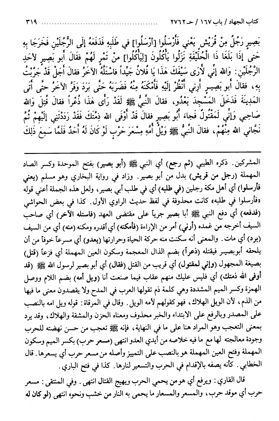 وَالْمَعْنَى أَنَّهُ سَكَنَتْ مِنْهُ حَرَكَةُ الْحَيَاةِ وَحَرَارَتُهَا (يَعْدُو) أَيْ مُسْرِعًا خَوْفًا مِنْ أَنْ يَلْحَقَهُ أَبُو بَصِيرٍ فَيَقْتُلُهُ (ذُعْرًا) بِضَمِّ الذَّالِ الْمُعْجَمَةِ وَسُكُونِ الْعَيْنِ الْمُهْمَلَةِ أَيْ فَزَعًا (قُتِلَ) بِصِيغَةِ الْمَجْهُولِ (وَإِنِّي لَمَقْتُولٌ) أَيْ قَرِيبٌ مِنَ الْقَتْلِ (فَقَالَ) أَيْ أَبُو بَصِيرٍ لِرَسُولِ اللَّهِ صَلَّى اللَّهُ عَلَيْهِ وَسَلَّمَ (قَدْ أَوْفَى اللَّهُ ذِمَّتَكَ) أَيْ فَلَيْسَ عَلَيْكَ مِنْهُمْ عِقَابٌ فِيمَا صَنَعْتُ أَنَا (وَيْلُ أُمِّهِ) بِضَمِّ اللَّامِ وَوَصْلِ الْهَمْزَةِ وَكَسْرِ الْمِيمِ الْمُشَدَّدَةِ وَهِيَ كَلِمَةُ ذَمٍّ تَقُولُهَا الْعَرَبُ فِي الْمَدْحِ وَلَا يَقْصِدُونَ مَعْنَى مَا فِيهَا مِنَ الذَّمِّ لِأَنَّ الْوَيْلَ الْهَلَاكُ فَهُوَ كَقَوْلِهِمْ لِأُمِّهِ الْوَيْلُ