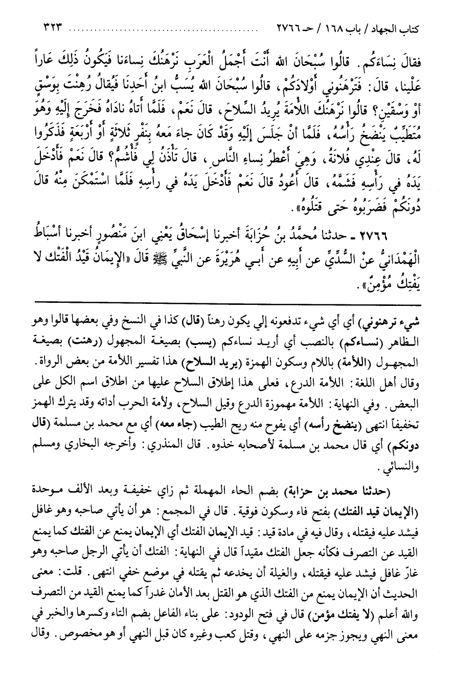[2769] (حَدَّثَنَا مُحَمَّدُ بْنُ حُزَابَةَ) بِضَمِّ الْحَاءِ الْمُهْمَلَةِ ثُمَّ زَايٍ خَفِيفَةٍ وَبَعْدَ الْأَلِفِ مُوَحَّدَةٌ (الْإِيمَانُ قَيَّدَ الْفَتْكَ) بِفَتْحِ فَاءٍ وَسُكُونِ فَوْقِيَّةٍ
