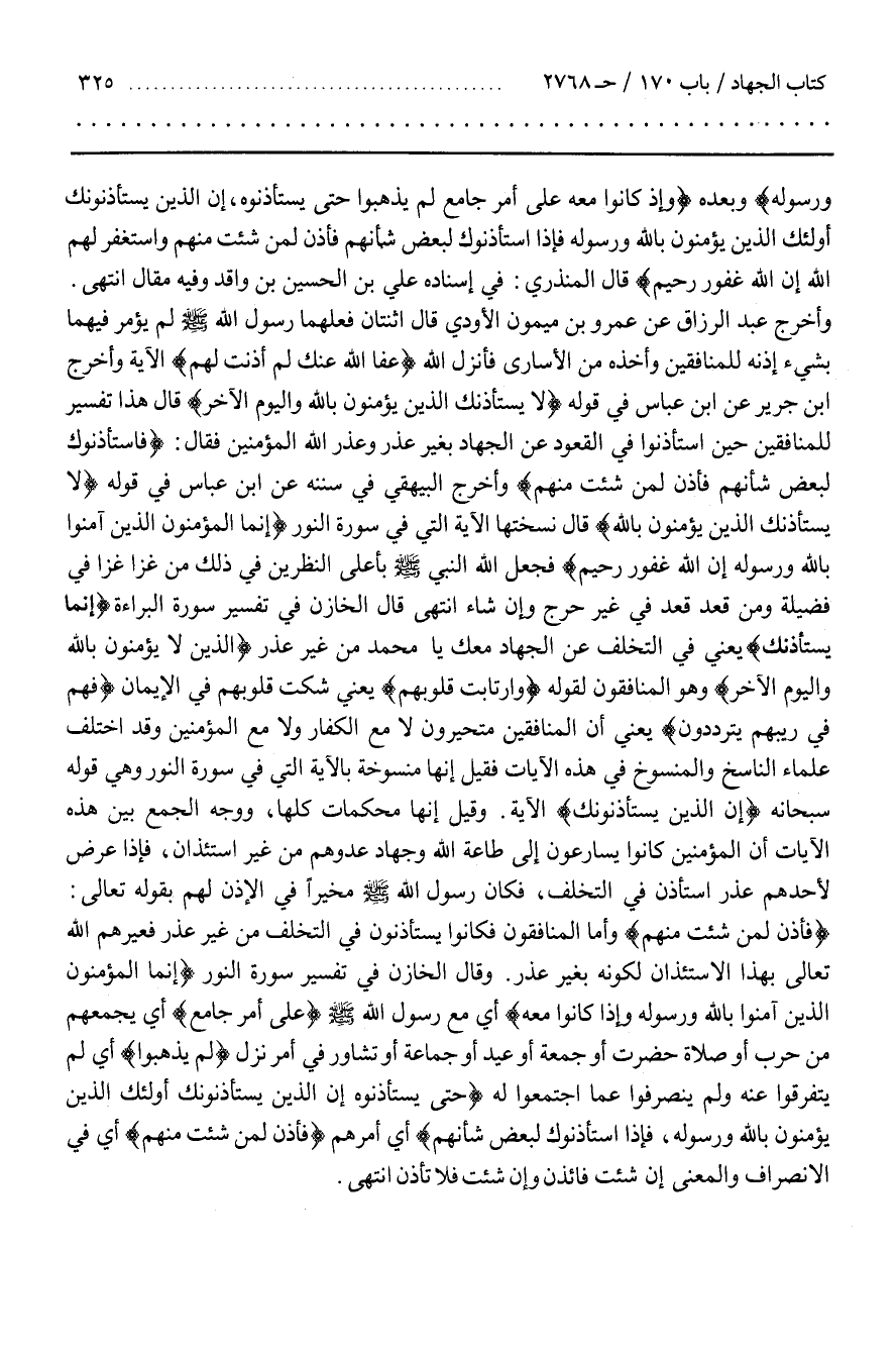 وَقَالَ الْخَازِنُ فِي تَفْسِيرِ سُورَةِ النُّورِ إِنَّمَا الْمُؤْمِنُونَ الَّذِينَ آمَنُوا بِاللَّهِ ورسوله وإذا كانوا مَعَهُ أَيْ مَعَ رَسُولِ اللَّهِ صَلَّى اللَّهُ عَلَيْهِ وَسَلَّمَ على أمر جامع أَيْ يَجْمَعُهُمْ مِنْ حَرْبٍ أَوْ صَلَاةٍ حَضَرَتْ أَوْ جُمُعَةٍ أَوْ عِيدٍ أَوْ جَمَاعَةٍ أَوْ تَشَاوُرٍ فِي أَمْرٍ نَزَلَ لَمْ يَذْهَبُوا أَيْ لَمْ يَتَفَرَّقُوا عَنْهُ وَلَمْ يَنْصَرِفُوا عَمَّا اجْتَمَعُوا لَهُ حَتَّى يَسْتَأْذِنُوهُ إِنَّ الَّذِينَ يَسْتَأْذِنُونَكَ أُولَئِكَ الَّذِينَ يُؤْمِنُونَ بِاللَّهِ وَرَسُولِهِ فَإِذَا اسْتَأْذَنُوكَ لِبَعْضِ شأنهم أي أمرهم (فأذن لمن شئت منهم) أي في الانصراف والمعنى إن شئت فائذن وَإِنْ شِئْتَ فَلَا تَأْذَنِ انْتَهَى