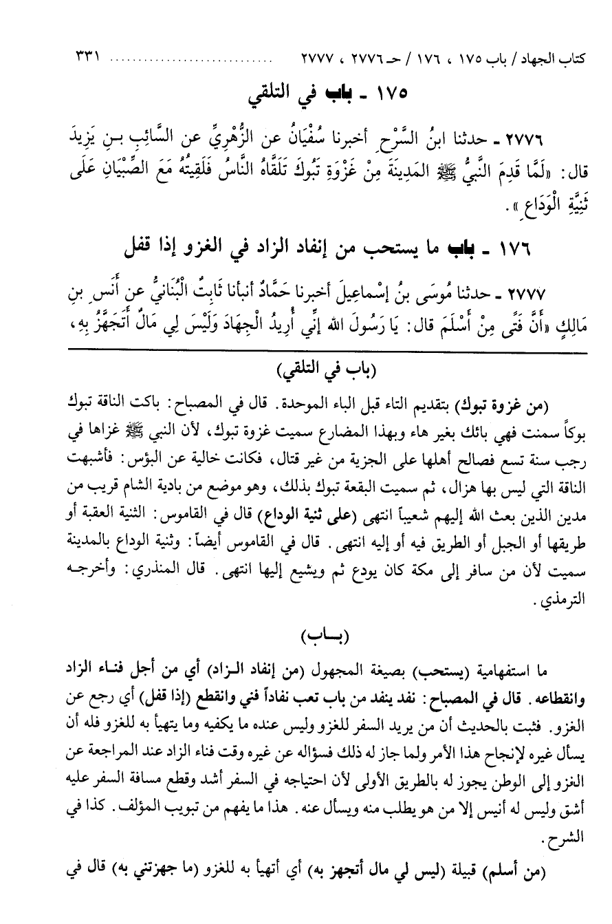فَثَبَتَ بِالْحَدِيثِ أَنَّ مَنْ يُرِيدُ السَّفَرَ لِلْغَزْوِ وَلَيْسَ عِنْدَهُ مَا يَكْفِيهِ وَمَا يَتَهَيَّأُ بِهِ لِلْغَزْوِ فَلَهُ أَنْ يَسْأَلَ غَيْرَهُ لِإِنْجَاحِ هَذَا الْأَمْرِ وَلَمَّا جَازَ لَهُ ذَلِكَ فَسُؤَالُهُ عَنْ غَيْرِهِ وَقْتَ فَنَاءِ الزَّادِ عِنْدَ الْمُرَاجَعَةِ عَنِ الْغَزْوِ إِلَى الْوَطَنِ يَجُوزُ لَهُ بِالطَّرِيقِ الْأَوْلَى لِأَنَّ احْتِيَاجَهُ فِي السَّفَرِ أَشَدُّ وَقَطْعَ مَسَافَةِ السَّفَرِ عَلَيْهِ أَشَقُّ وَلَيْسَ لَهُ أَنِيسٌ إِلَّا مَنْ هُوَ يَطْلُبُ مِنْهُ وَيَسْأَلُ عَنْهُ