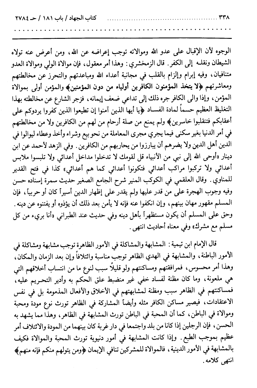 وَإِذَا كَانَتِ الْمُشَابَهَةُ فِي أُمُورٍ دُنْيَوِيَّةٍ تُورِثُ الْمَحَبَّةَ وَالْمُوَالَاةَ فَكَيْفَ بِالْمُشَابَهَةِ فِي الْأُمُورِ الدِّينِيَّةِ فَالْمُوَالَاةُ لِلْمُشْرِكِينَ تُنَافِي الْإِيمَانَ وَمَنْ يَتَوَلَّهُمْ مِنْكُمْ فَإِنَّهُ مِنْهُمْ انتهى كلامه