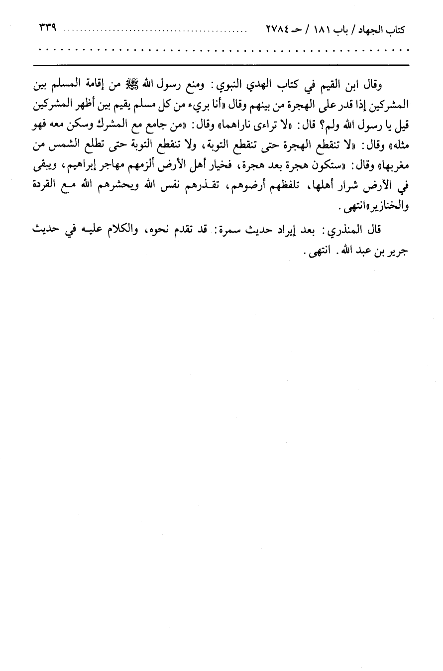 وقال بن الْقَيِّمِ فِي كِتَابِ الْهَدْيِ النَّبَوِيِّ وَمَنَعَ رَسُولُ اللَّهِ صَلَّى اللَّهُ عَلَيْهِ وَسَلَّمَ مِنْ إِقَامَةِ الْمُسْلِمِ بَيْنَ الْمُشْرِكَيْنِ إِذَا قَدَرَ عَلَى الْهِجْرَةِ مِنْ بَيْنِهِمْ وَقَالَ أَنَا بَرِيءٌ مِنْ كُلِّ مسلم يقيم بين أظهر المشركين قيل يارسول اللَّهِ وَلِمَ قَالَ لَا تَرَاءَى نَارَاهُمَا وَقَالَ مَنْ جَامَعَ مَعَ الْمُشْرِكِ وَسَكَنَ مَعَهُ فَهُوَ مِثْلُهُ وَقَالَ لَا تَنْقَطِعُ الْهِجْرَةُ حَتَّى تَنْقَطِعَ التَّوْبَةُ وَلَا تَنْقَطِعُ التَّوْبَةُ حَتَّى تَطْلُعَ الشَّمْسُ مِنْ مَغْرِبِهَا وَقَالَ سَتَكُونُ هِجْرَةٌ بَعْدَ هِجْرَةٍ فَخِيَارُ أَهْلِ الْأَرْضِ أَلْزَمُهُمْ مَهَاجِرَ إِبْرَاهِيمَ وَيَبْقَى فِي الْأَرْضِ شِرَارُ أَهْلِهَا يَلْفِظُهُمْ أَرَضُوهُمْ تُقْذِرُهُمْ نَفْسُ اللَّهِ وَيَحْشُرُهُمُ اللَّهُ مَعَ الْقِرَدَةِ وَالْخَنَازِيرِ انْتَهَى
