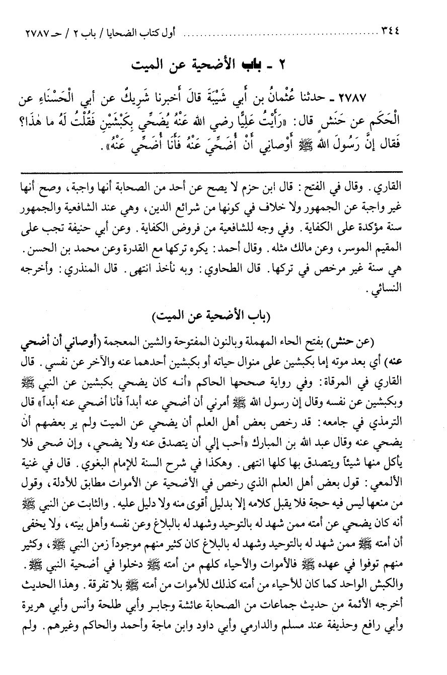قال القارىء فِي الْمِرْقَاةِ وَفِي رِوَايَةٍ صَحَّحَهَا الْحَاكِمُ أَنَّهُ كَانَ يُضَحِّي بِكَبْشَيْنِ عَنِ النَّبِيِّ صَلَّى اللَّهُ عَلَيْهِ وَسَلَّمَ وَبِكَبْشَيْنِ عَنْ نَفْسِهِ وَقَالَ إِنَّ رَسُولَ اللَّهِ صَلَّى اللَّهُ عَلَيْهِ وَسَلَّمَ أَمَرَنِي أَنْ أُضَحِّيَ عَنْهُ أَبَدًا فَأَنَا أُضَحِّي عَنْهُ أَبَدًا قَالَ التِّرْمِذِيُّ فِي جَامِعِهِ قَدْ رَخَّصَ بَعْضُ أَهْلِ الْعِلْمِ أَنْ يُضَحَّى عَنِ الْمَيِّتِ وَلَمْ يَرَ بَعْضُهُمْ أَنْ يُضَحَّى عَنْهُ وَقَالَ عَبْدُ اللَّهِ بْنُ الْمُبَارَكِ أَحَبُّ إِلَيَّ أَنْ يُتَصَدَّقَ عَنْهُ وَلَا يُضَحَّى وَإِنْ ضَحَّى فَلَا يَأْكُلُ مِنْهَا شَيْئًا وَيَتَصَدَّقُ بِهَا كُلِّهَا انْتَهَى
