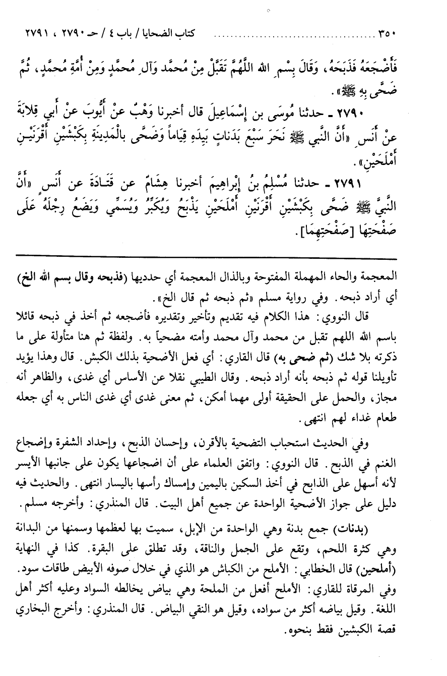 قَالَ النَّوَوِيُّ هَذَا الْكَلَامُ فِيهِ تَقْدِيمٌ وَتَأْخِيرٌ وَتَقْدِيرُهُ فَأَضْجَعَهُ ثُمَّ أَخَذَ فِي ذَبْحِهِ قَائِلًا بِاسْمِ اللَّهِ اللَّهُمَّ تَقَبَّلْ مِنْ مُحَمَّدٍ وَآلِ مُحَمَّدٍ وَأُمَّتِهِ مُضَحِّيًا بِهِ
