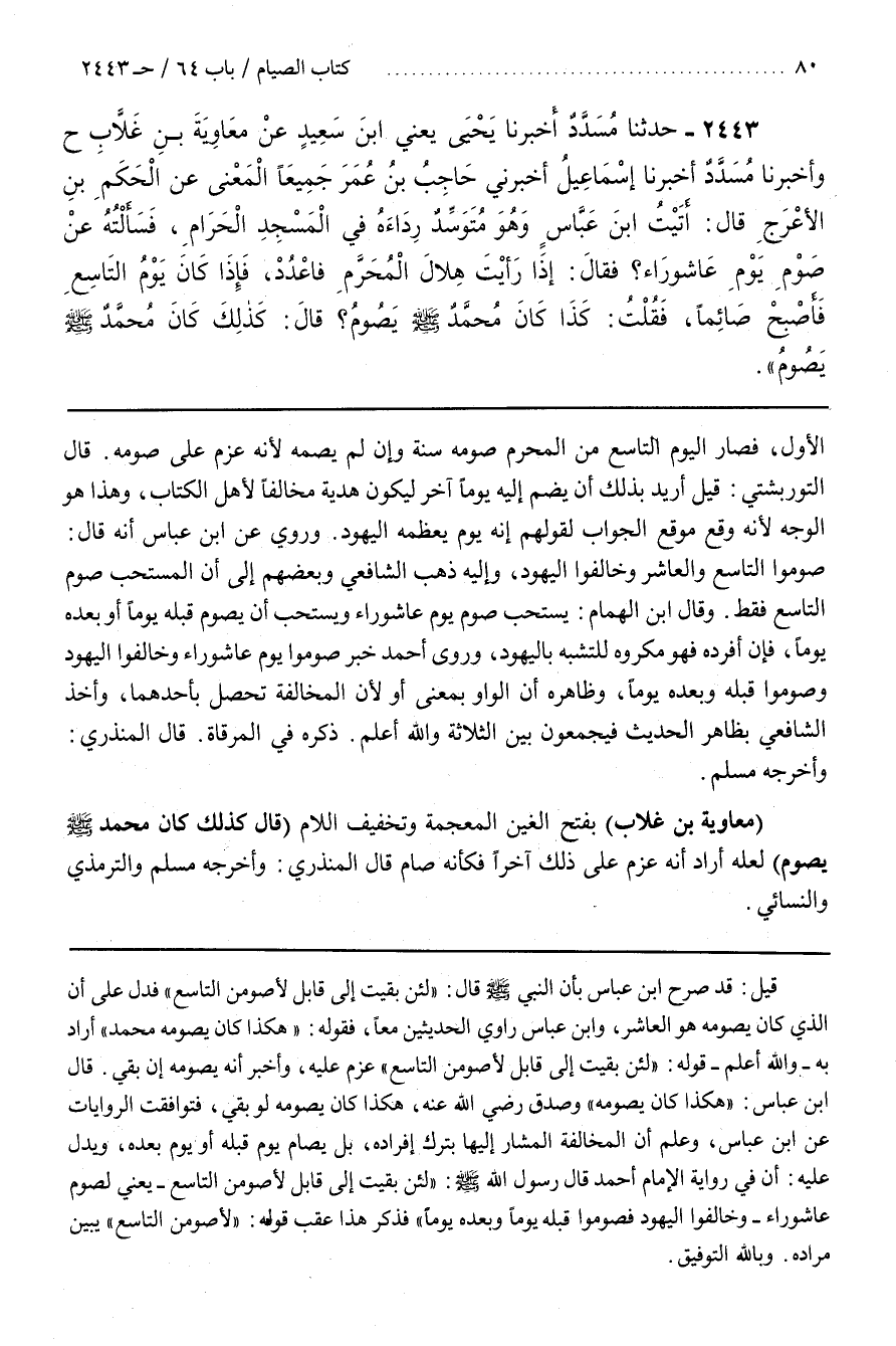 ــــــــــــQقيل قد صرح بن عَبَّاس بِأَنَّ النَّبِيّ صَلَّى اللَّه عَلَيْهِ وَسَلَّمَ قَالَ لَئِنْ بَقِيت إِلَى قَابِلٍ لَأَصُومَنَّ التَّاسِع فَدَلَّ عَلَى أَنَّ الَّذِي كَانَ يَصُومهُ هُوَ العاشر وبن عَبَّاس رَاوِي الْحَدِيثَيْنِ مَعًا فَقَوْله هَكَذَا كَانَ يَصُومهُ مُحَمَّد أَرَادَ بِهِ وَاَللَّه أَعْلَم قَوْله لَئِنْ بَقِيت إِلَى قَابِلٍ لَأَصُومَنَّ التَّاسِع عَزَمَ عَلَيْهِ وَأَخْبَرَ أَنَّهُ يَصُومهُ إِنْ بَقِيَ