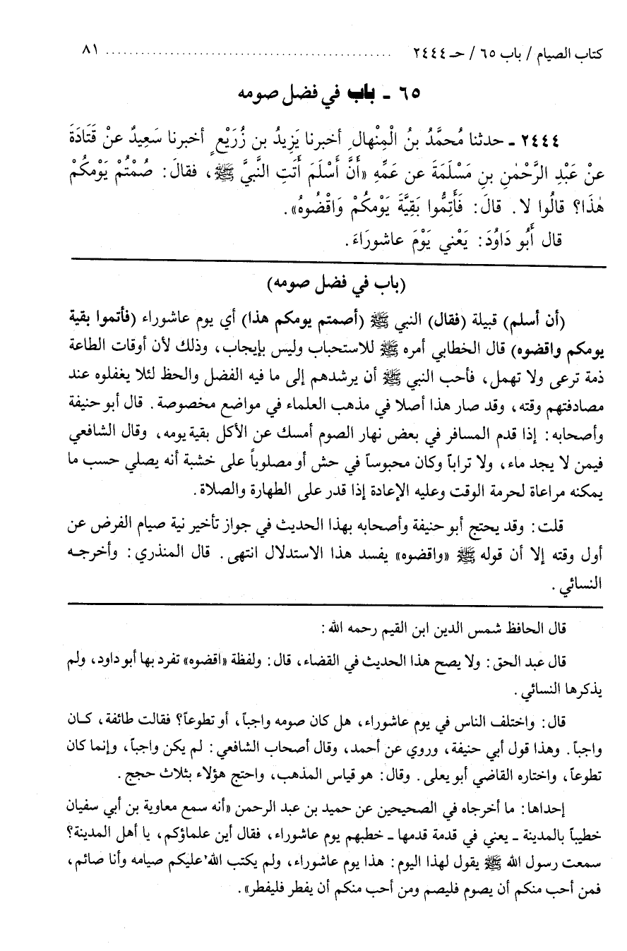 (أَنَّ أَسْلَمَ) قَبِيلَةٌ (فَقَالَ) النَّبِيُّ صَلَّى اللَّهُ عَلَيْهِ وَسَلَّمَ (أَصُمْتُمْ يَوْمَكُمْ هَذَا) أَيْ يَوْمَ عَاشُورَاءَ (فَأَتِمُّوا بَقِيَّةَ يَوْمِكُمْ وَاقْضُوهُ) قَالَ الْخَطَّابِيُّ أَمْرُهُ صَلَّى اللَّهُ عَلَيْهِ وَسَلَّمَ لِلِاسْتِحْبَابِ وَلَيْسَ بِإِيجَابٍ وَذَلِكَ لِأَنَّ لِأَوْقَاتِ الطَّاعَةِ ذِمَّةً تُرْعَى وَلَا تُهْمَلُ فَأَحَبَّ النَّبِيُّ صَلَّى اللَّهُ عَلَيْهِ وَسَلَّمَ أَنْ يُرْشِدَهُمْ إِلَى مَا فِيهِ الْفَضْلُ وَالْحَظُّ لِئَلَّا يُغْفِلُوهُ عِنْدَ مُصَادَفَتِهِمْ وَقْتَهُ وَقَدْ صَارَ هَذَا أَصْلًا فِي مَذْهَبِ الْعُلَمَاءِ فِي مَوَاضِعَ مَخْصُوصَةٍ