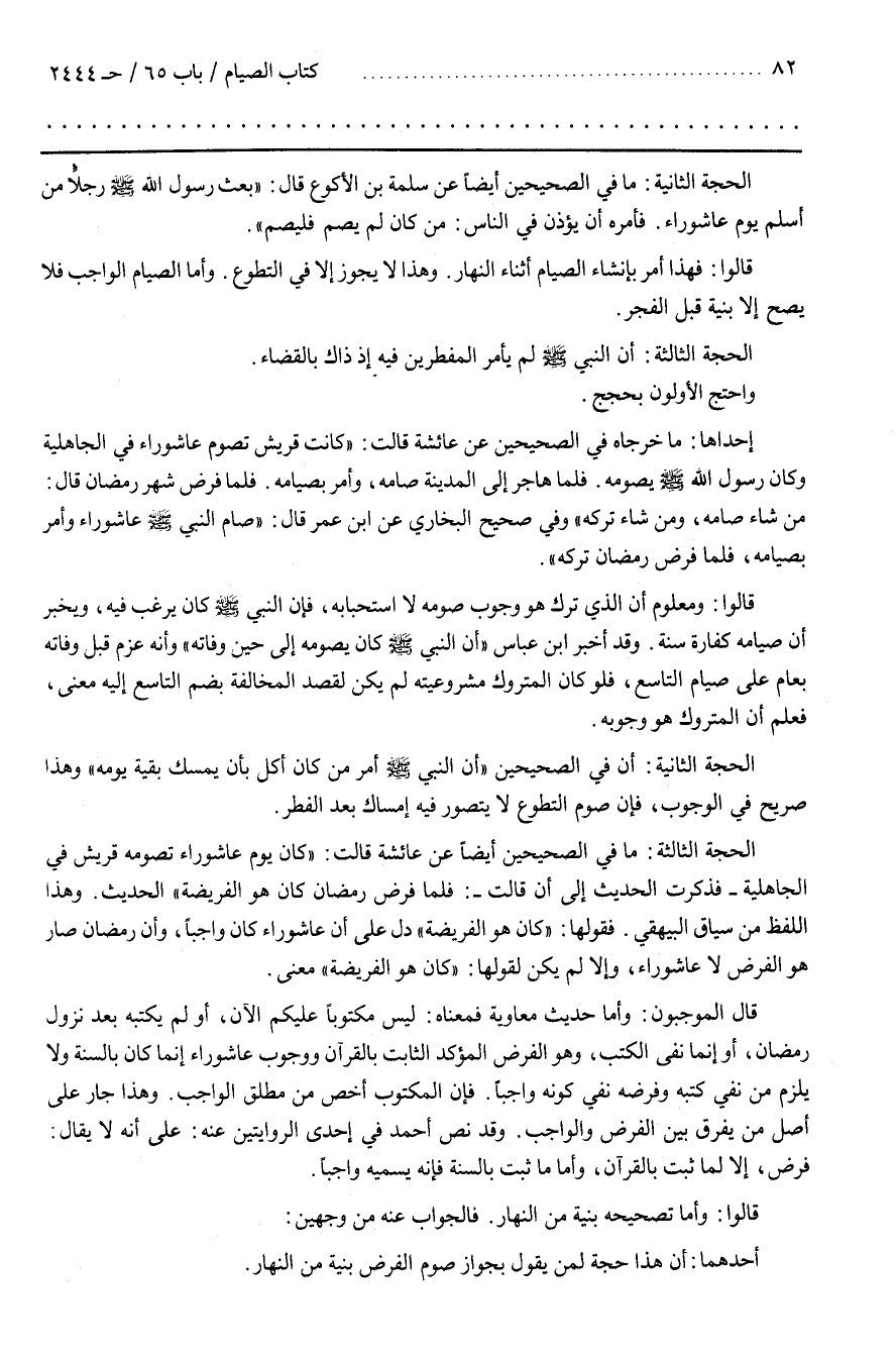 ــــــــــــQالْحُجَّة الثَّانِيَة مَا فِي الصَّحِيحَيْنِ أَيْضًا عَنْ سَلَمَة بْن الْأَكْوَع قَالَ بَعَثَ رَسُول اللَّه صَلَّى اللَّه عَلَيْهِ وَسَلَّمَ رَجُلًا مِنْ أَسْلَمَ يَوْم عَاشُورَاء فَأَمَرَهُ أَنْ يُؤَذِّن فِي النَّاس مَنْ كَانَ لَمْ يَصُمْ فَلْيَصُمْ قَالُوا فَهَذَا أَمْرٌ بِإِنْشَاءِ الصِّيَام أَثْنَاء النَّهَار