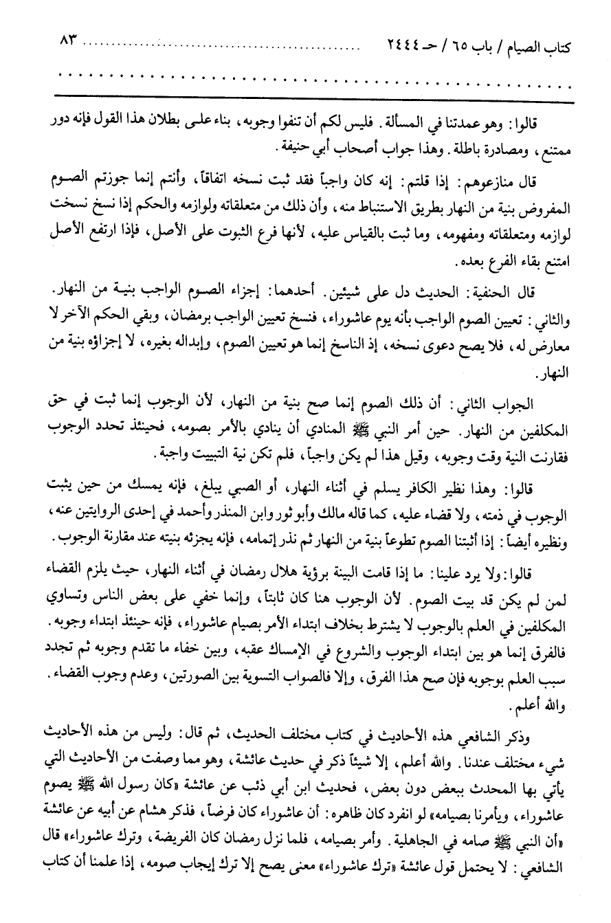وَالثَّانِي تَعْيِينُ الصَّوْم الْوَاجِب بِأَنَّهُ يَوْم عَاشُورَاء فَنُسِخَ تَعْيِين الْوَاجِب بِرَمَضَان وَبَقِيَ الْحُكْم الْآخَر لَا مُعَارِض لَهُ فَلَا يَصِحّ دَعْوَى نَسْخه إِذْ النَّاسِخ إِنَّمَا هُوَ تَعْيِين الصَّوْم وَإِبْدَاله بِغَيْرِهِ لَا إِجْزَاؤُهُ بِنِيَّةٍ مِنْ النَّهَار