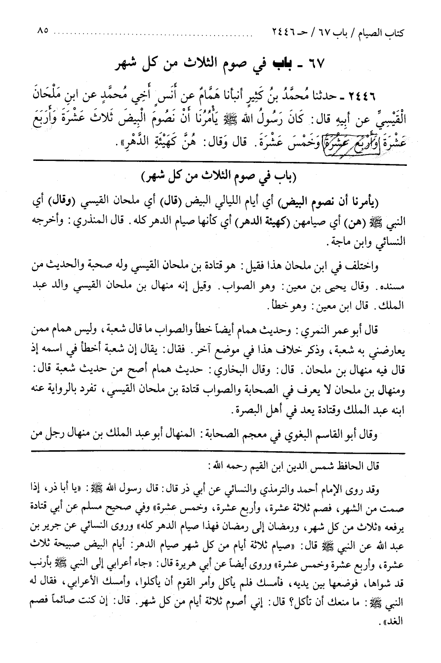 ــــــــــــQقال الحافظ شمس الدين بن القيم رحمه اللَّه وَقَدْ رَوَى الْإِمَام أَحْمَد وَالتِّرْمِذِيُّ وَالنَّسَائِيّ عن أبي ذر قال قال رسول الله صَلَّى اللَّه عَلَيْهِ وَسَلَّمَ يَا أَبَا ذَرّ إِذَا صُمْت مِنْ الشَّهْر فَصُمْ ثَلَاثَة عَشْرَة وَأَرْبَع عَشْرَة وَخَمْس عَشْرَة وَفِي صَحِيحِ مُسْلِم عَنْ أَبِي قَتَادَة يَرْفَعُهُ ثَلَاث مِنْ كُلّ شَهْر وَرَمَضَان إِلَى رَمَضَان فَهَذَا صِيَام الدَّهْر كُلّه وَرَوَى النَّسَائِيّ عَنْ جَرِير بْن عَبْد اللَّه عَنْ النَّبِيّ صَلَّى اللَّه عَلَيْهِ وَسَلَّمَ قَالَ صِيَام ثَلَاثَة أَيَّام مِنْ كُلّ شَهْر صِيَام الدَّهْر أَيَّام الْبِيض صَبِيحَة ثَلَاث عَشْرَة وَأَرْبَع عَشْرَة وَخَمْس عَشْرَة وَرَوَى أَيْضًا عَنْ أَبِي هُرَيْرَة قَالَ جَاءَ أَعْرَابِيٌّ إِلَى النَّبِيّ صَلَّى اللَّه عَلَيْهِ وَسَلَّمَ بِأَرْنَبٍ قَدْ شَوَاهَا فَوَضَعَهَا بَيْن يَدَيْهِ فَأَمْسَكَ فَلَمْ يَأْكُل وَأَمَرَ الْقَوْم أَنْ يَأْكُلُوا وَأَمْسَكَ الْأَعْرَابِيُّ فَقَالَ لَهُ النَّبِيُّ صَلَّى اللَّه عَلَيْهِ وَسَلَّمَ مَا مَنَعَك أَنْ تَأْكُل قَالَ إِنِّي أَصُوم ثَلَاثَةَ أَيَّام مِنْ كُلّ شَهْر