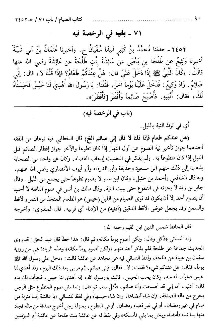 ــــــــــــQقال الحافظ شمس الدين بن القيم رحمه اللَّه زَادَ النَّسَائِيّ فَأَكَلَ وَقَالَ وَلَكِنْ أَصُوم يَوْمًا مَكَانه ثُمَّ قَالَ هَذَا خَطَأٌ قَالَ عَبْد الْحَقّ قَدْ رَوَى الْحَدِيث جَمَاعَة عَنْ طَلْحَة فَلَمْ يَذْكُر أَحَدٌ مِنْهُمْ وَلَكِنْ أَصُوم يَوْمًا مَكَانه وَهَذِهِ الزِّيَادَة هِيَ مِنْ رِوَايَة سُفْيَان بْن عُيَيْنَة عَنْ طَلْحَة وَلَفْظ النَّسَائِيّ فِيهِ عَنْ مُجَاهِد عَنْ عَائِشَة قَالَتْ دَخَلَ علي رسول الله صلى الله عليه وسلم يَوْمًا فَقَالَ هَلْ عِنْدكُمْ شَيْء فَقُلْت لَا