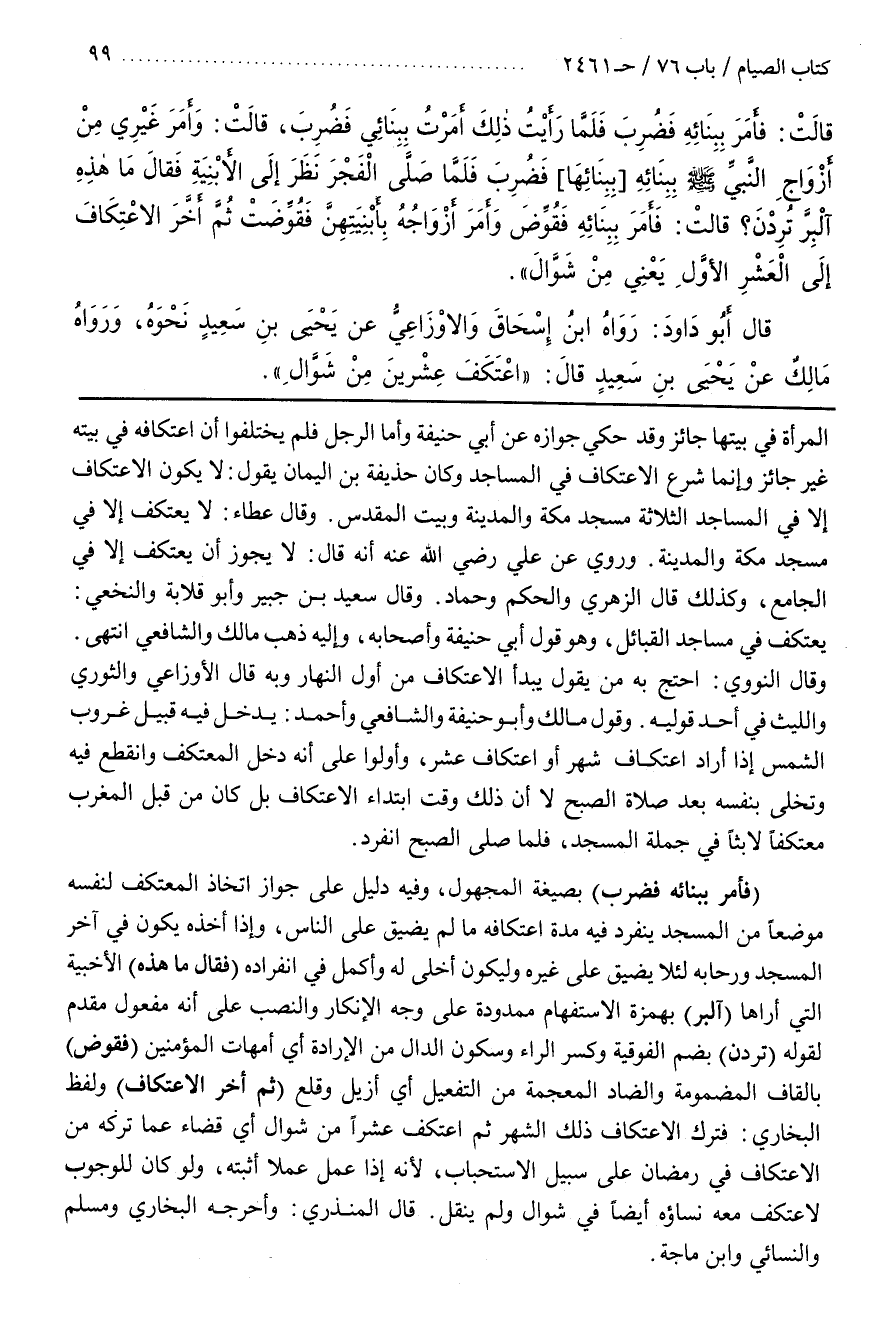 (فَأَمَرَ بِبِنَائِهِ فَضُرِبَ) بِصِيغَةِ الْمَجْهُولِ وَفِيهِ دَلِيلُ عَلَى جَوَازِ اتِّخَاذِ الْمُعْتَكِفِ لِنَفْسِهِ مَوْضِعًا مِنَ الْمَسْجِدِ يَنْفَرِدُ فِيهِ مُدَّةَ اعْتِكَافِهِ مَا لَمْ يُضَيِّقْ عَلَى النَّاسِ وَإِذَا أَخَذَهُ يَكُونُ فِي آخِرِ الْمَسْجِدِ وَرِحَابِهِ لِئَلَّا يُضَيِّقَ عَلَى غَيْرِهِ وَلِيَكُونَ أَخْلَى لَهُ وَأَكْمَلَ فِي انْفِرَادِهِ (فَقَالَ مَا هَذِهِ) الْأَخْبِيَةُ الَّتِي أَرَاهَا (آلْبِرَّ) بِهَمْزَةِ الِاسْتِفْهَامِ مَمْدُودَةً عَلَى وَجْهِ الْإِنْكَارِ وَالنَّصْبُ عَلَى أَنَّهُ مَفْعُولٌ مُقَدَّمٌ لِقَوْلِهِ (تُرِدْنَ) بِضَمِّ الْفَوْقِيَّةِ وَكَسْرِ الرَّاءِ وَسُكُونِ الدَّالِ مِنَ الْإِرَادَةِ أَيْ أُمَّهَاتُ الْمُؤْمِنِينَ (فَقُوِّضَ) بِالْقَافِ الْمَضْمُومَةِ وَالضَّادِ الْمُعْجَمَةِ مِنَ التَّفْعِيلِ أَيْ أُزِيلَ وَقُلِعَ (ثُمَّ أَخَّرَ الِاعْتِكَافَ) وَلَفْظُ الْبُخَارِيِّ فَتَرَكَ الِاعْتِكَافَ ذَلِكَ الشَّهْرَ ثُمَّ اعْتَكَفَ عَشْرًا مِنْ شَوَّالٍ أَيْ قَضَاءً عَمَّا تَرَكَهُ مِنَ الِاعْتِكَافِ فِي رَمَضَانَ عَلَى سَبِيلِ الِاسْتِحْبَابِ لِأَنَّهُ إِذَا عَمِلَ عَمَلًا أَثْبَتَهُ وَلَوْ كَانَ لِلْوُجُوبِ لَاعْتَكَفَ مَعَهُ نِسَاؤُهُ أَيْضًا فِي شَوَّالٍ وَلَمْ يُنْقَلْ