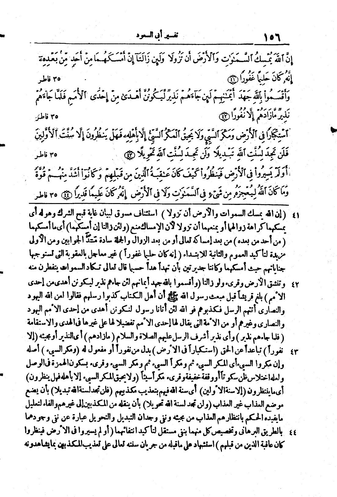 41 - 44 {إن الله يمسك السماوات والارض أَن تَزُولاَ} استئنافٌ مسوقٌ لبيانِ غايةِ قُبحِ الشرك وهو له أي يمسكها كراهةَ زوالِهما أو يمنعهما أنْ تزولا لأنَّ الإمساك منع {وَلَئِن زَالَتَا إِنْ أَمْسَكَهُمَا} أي مَا أمسكهما {مِنْ أَحَدٍ مِن بَعْدِهِ} من بعدِ إمساكِه تعالى أو من بعدِ الزَّوالِ والجملةُ سادَّةٌ مسدَّ الجوابينِ ومن الأولى مزيدة لتأكيد العُمومِ والثَّانيةُ للابتداءِ {إِنَّهُ كَانَ حَلِيمًا غَفُورًا} غيرَ معاجلٍ بالعقوبةِ التي تستوجبُها جناياتُهم حيثُ أمسكَهما وكانتا جديرتينِ بأنْ تهدّا هداً حسبما قال تعالى تَكَادُ السموات يَتَفَطَّرْنَ مِنْهُ وَتَنشَقُّ الارض وقُرىء ولو زَالَتا