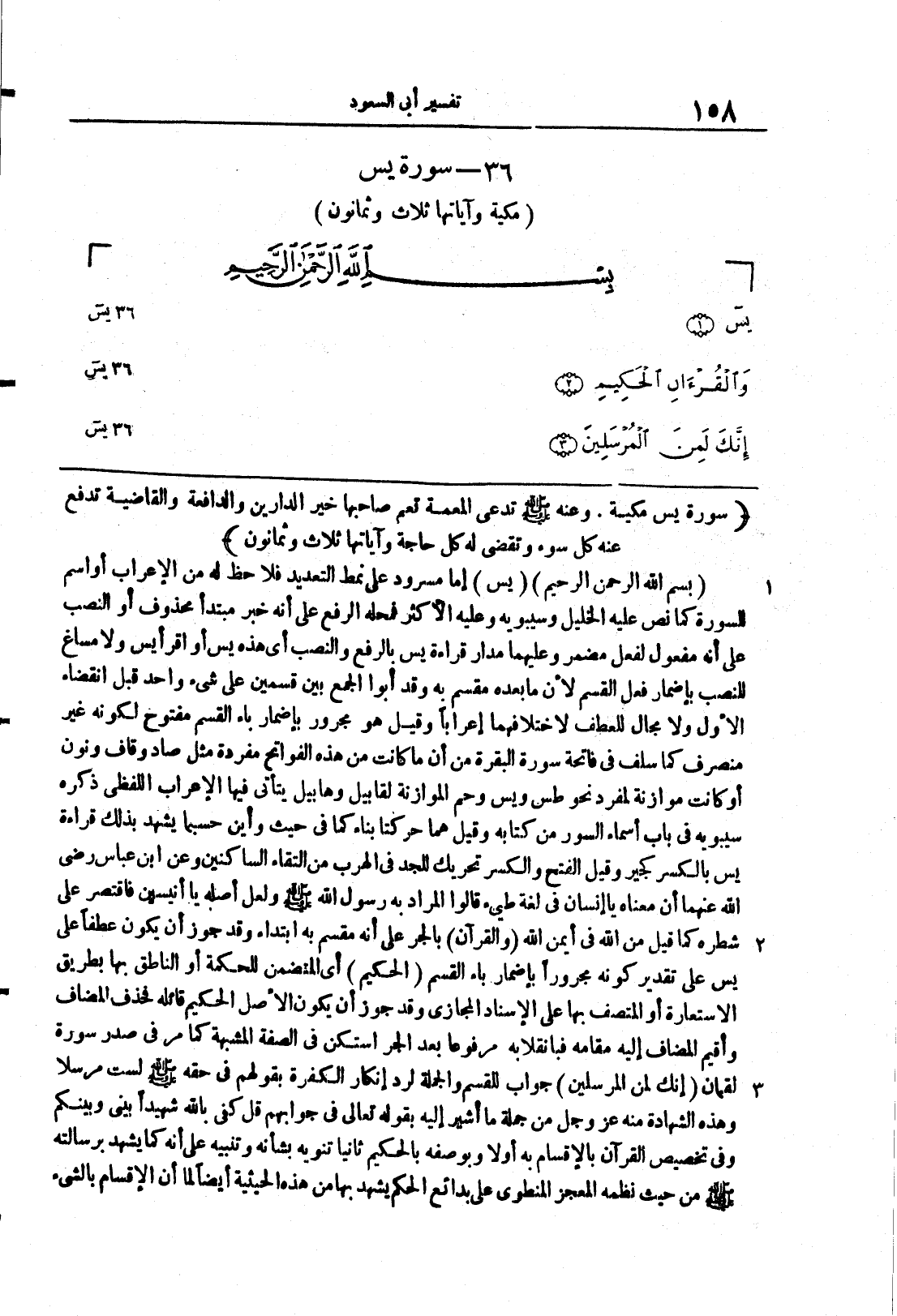 {يس} إمَّا مسرودٌ على نمطِ التَعديدِ فلا حظَّ له من الإعرابِ أو اسم السورة كما نصَّ عليه الخليلُ وسيبويةِ وعليه الأكثرِ فمحلُّه الرفعُ على أنَّه خبرُ مبتدأٍ محذوفٍ أو النَّصبُ على أنه مفعول لفعل مضمرٍ وعليهما مدارُ قراءةِ يس بالرَّفع والنَّصبِ أي هَذه يس او اقرا يس ولا مَساغَ للنَّصب بإضمارِ فعلِ القسمِ لأنَّ ما بعدَهُ مُقسمٌ بِه وقد ابو الجمعَ بين قَسَمين على شيءٍ واحدٍ قبل انقضاءِ الأوَّلِ ولا مجالَ للعطفِ لاختلافِهما إعراباً وقيل هو مجرورٌ بإضمارِ باءِ القسمِ مفتوحٌ لكونِه غيرَ منصرفٍ كما سلف في فاتحةِ سُورة البقرةِ من أنَّ ما كانتْ من هذه الفواتحِ مفردة مثلَ صاد وقاف ونون أو كانت موازنةً لمفردٍ نحوِ طس ويس وحم الموازنةِ لقابيلَ وهابيلَ يتأتَّى فيها الإعرابُ اللفظيُ ذكره سيبويه في بابِ أسماءِ السُّورِ من كتابِه وقيل هُما حركتا بناءٍ كما في حيثُ وأينَ حسَبما يشهدُ بذلك قراءة يس بالكسر كجَيْرِ وقيل الفتحُ والكسرُ تحريكٌ للجِدِّ في الهربِ من التقاءِ السَّاكنينِ وعن ابن عباس رضي الله عنهما أنَّ معناه يا إنسانُ في لغةِ طَيءٍ قالُوا المرادُ به رسولُ الله صلى الله عليه وسلم ولعلَّ أصلَه يا أُنيسين فاقتُصر على شطرِه كما قيل مَنُ الله في ايمن الله