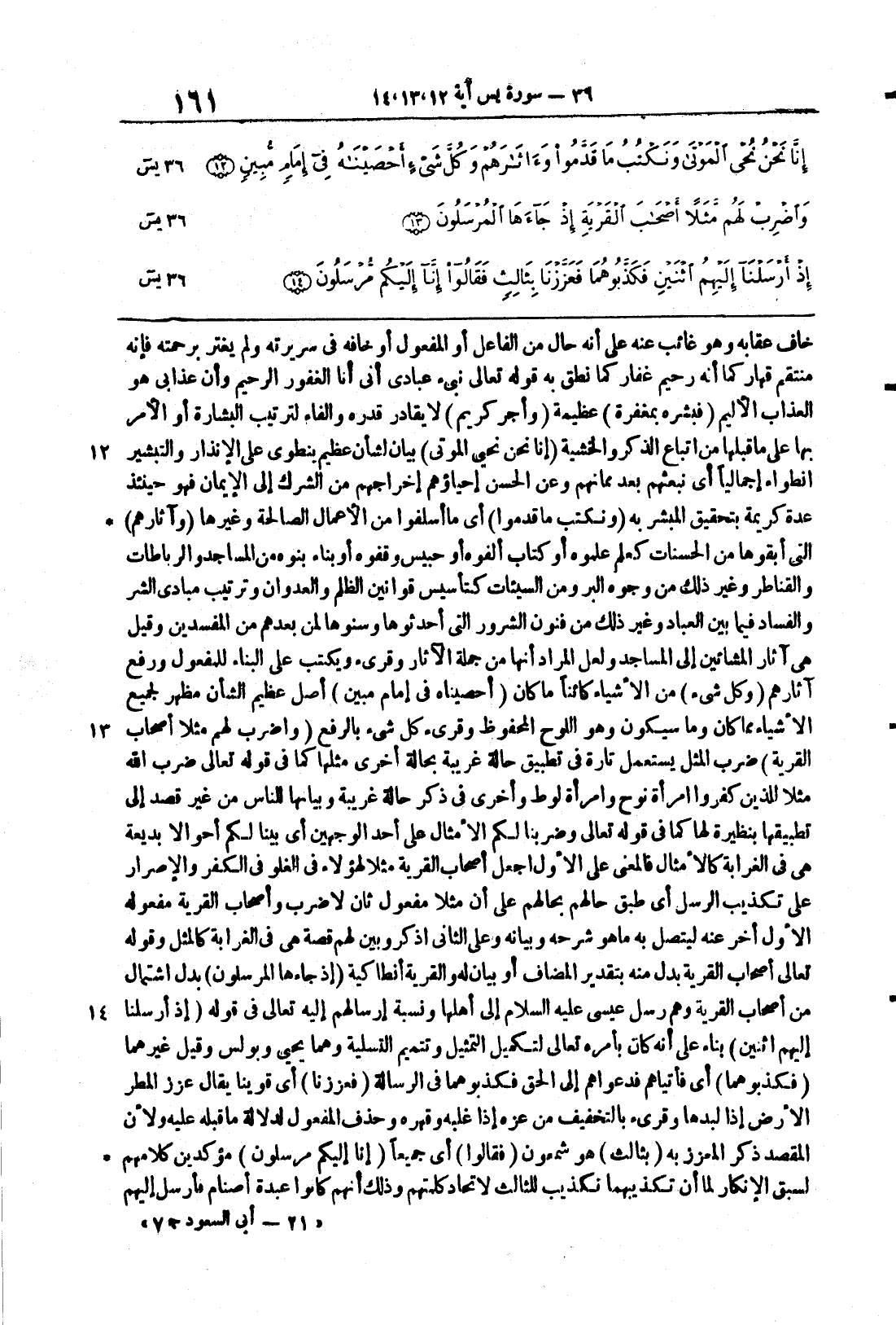 {واضرب لَهُمْ مَّثَلاً أصحاب القرية} ضربُ المَثَلِ يُستعملُ تارةً في تطبيقِ حالةٍ غريبةٍ بحالةٍ أُخرى مثلِها كما في قوله تعالى ضَرَبَ الله مَثَلاً لّلَّذِينَ كفروا امراة نوح وامراة لُوطٍ وأخرى في ذكر حالةٍ غريبةٍ وبيانِها للنَّاس من غير قصدٍ إلى تطبيقِها بنظيرةِ لها كما في قولِهِ تعالى وَضَرَبْنَا لَكُمُ الامثال على أحدِ الوجهينِ أي بيَّنا لكم أحوالاً بديعةً هي في الغرابةِ كالأمثالِ فالمَعْنى على الأوّلِ اجعلْ أصحابَ القريةِ مثلاً لهؤلاء في الغُلوِّ في الكفرِ والإصرارِ على تكذيبِ الرُّسلِ أي طبِّق حالَهم بحالهم على أنَّ مثلاً مفعولٌ ثان لا ضرب وأصحابَ القريةِ مفعولُه الأوَّلَ أُخِّر عنْهُ ليتَّصل بهِ ما هو شرحُه وبيانُه وعلى الثَّاني اذكُر وبيِّن لهم قصَّةً هي في الغرابةِ كالمَثَل وقوله تعالى أصحابَ القريةِ بدلٌ منه بتقديرِ المضافِ أو بيانٌ له والقريةُ أنطاكيِّةُ {إِذْ جَاءهَا المرسلون} بدلُ اشتمالٍ من أصحابَ القريةِ وهم رُسلُ عيسى عليه السَّلامُ إلى أهلِها ونسبةُ إرسالِهم إليهِ تعالى في قولِه