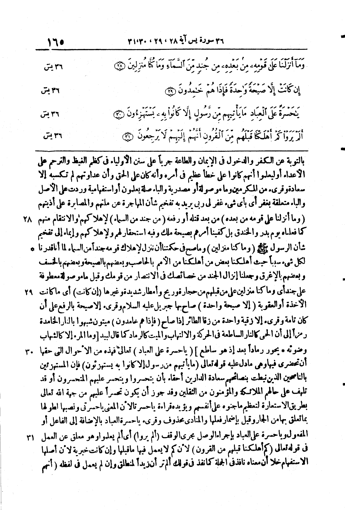 يس 28 31 بالتَّوبةِ عن الكُفرِ والدخول في الإيمانِ والطَّاعةِ جرياً على سَننِ الأولياء في كظم الغيظ والتَّرحمِ على الأعداءِ أو ليعلموا أنهم كانُوا على خطأٍ عظيمٍ في أمره وأنَّه كان على الحقِّ وأنَّ عداوتَهم لم تكسبه إلاَّ سعادةً وقُرىء من المكرمين وما موصولةٌ أو مصدريةٌ والباء صلةُ يعلمون أو استفهاميةٌ وردت على الاصل والباء متعلِّقةٌ بغفرَ أي بأي شيءٍ غفرَ لي ربِّي يريدُ به تفخيمَ شأنِ المهاجرةِ عن ملَّتِهم والمصابرةِ على أذيَّتِهم