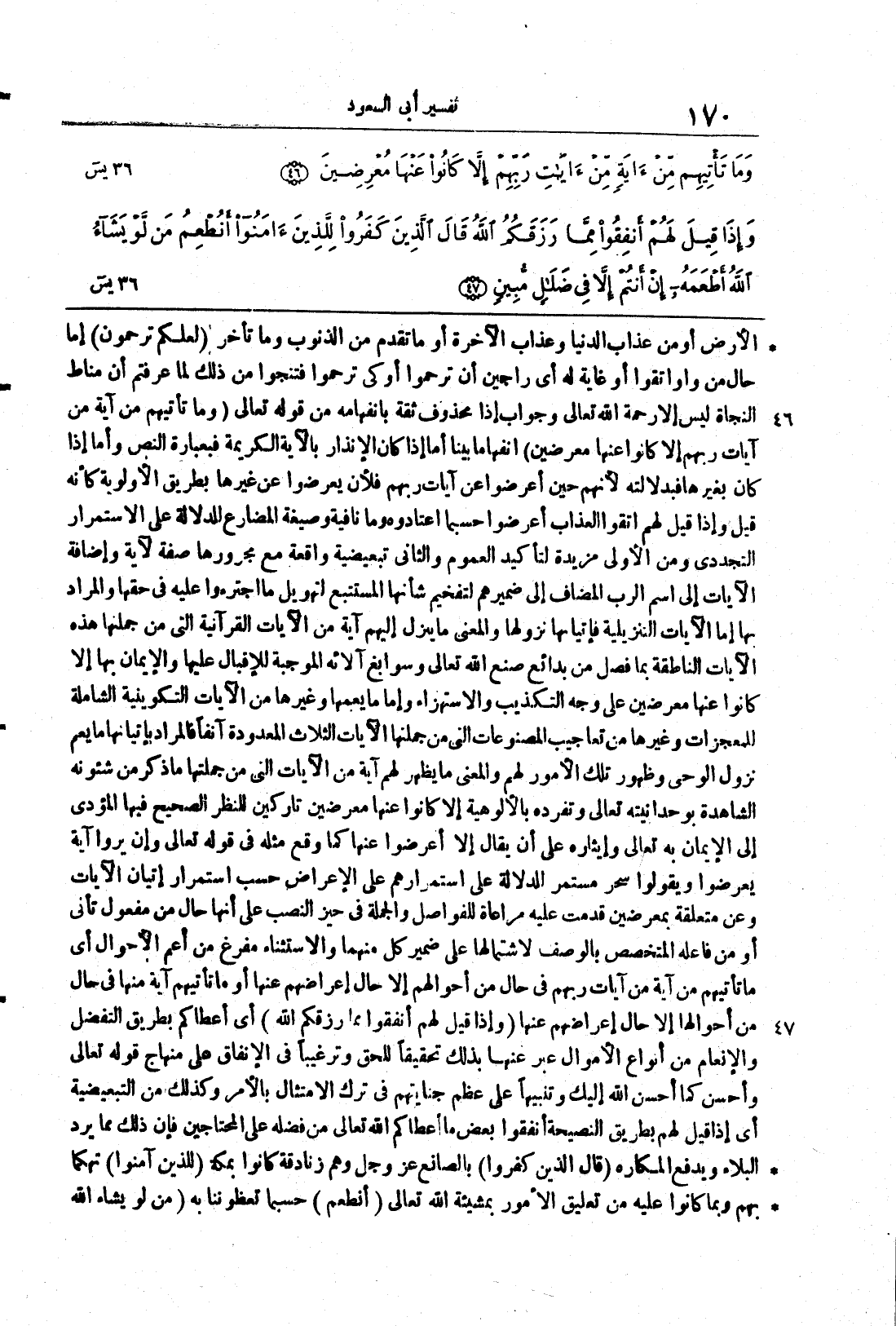يس 46 47 الأرض أو من عذابَ الدُّنيا وعذابَ الآخرةِ أو ما تقدَّم من الذُّنوبِ وما تأخَّر {لَعَلَّكُمْ تُرْحَمُونَ} إمَّا حال من واوِ اتقوا أو غايةٌ له أي راجين أنْ تُرحموا أو كي تُرحموا فتنجُوا من ذلك لما عرفتُم أنَّ مناط النَّجاةِ ليس إلاَّ رحمةَ الله تعالى وجوابُ إذا محذوف ثقةً بانفهامِه من قوله تعالى