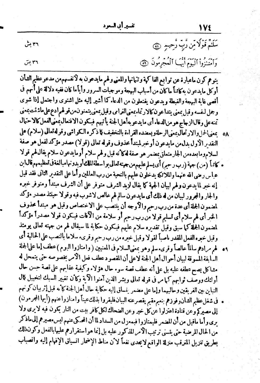 يس 58 59 يتوهم كونِ ما عبارةً عن توابعِ الفاكهةِ وتتماتها والمَعْنى ولهم ما يدَّعون به لأنفسِهم من مدعوَ عظيمِ الشَّأنِ أو كل ما يدَّعُون به كائناً ما كانَ منْ أسبابِ البهجةِ وموجباتِ السرُّورِ وأيا ما كان ففيه دلالة على أنَّهم في أقصى غايةِ البهجةِ والغبطةِ ويدّعون يفتعلونَ من الدُّعاءِ كما أُشير إليه مثل اشتوى واجتمَل إذا شوَى وجمل لنفسهِ وقيل بمعنى يتداعون كالارتماءِ بمعنى التَّرامي وقيل بمعنى يتمَّنون من قولِهم ادعُ على ما شئتَ بمعنى تمنَّه علي وقال الزَّجَّاجُ هو من الدُّعاءِ أي ما يدعُو به أهلُ الجنَّةِ يأتيهم فيكون الافتعالِ بمعنى الفعلِ كالاحتمالِ بمعنى الحملِ والارتحالِ بمعنى الرِّحلةِ ويعضدُه القراءةُ بالتَّخفيفِ كما ذكره الكواشيُّ وقوله تعالى