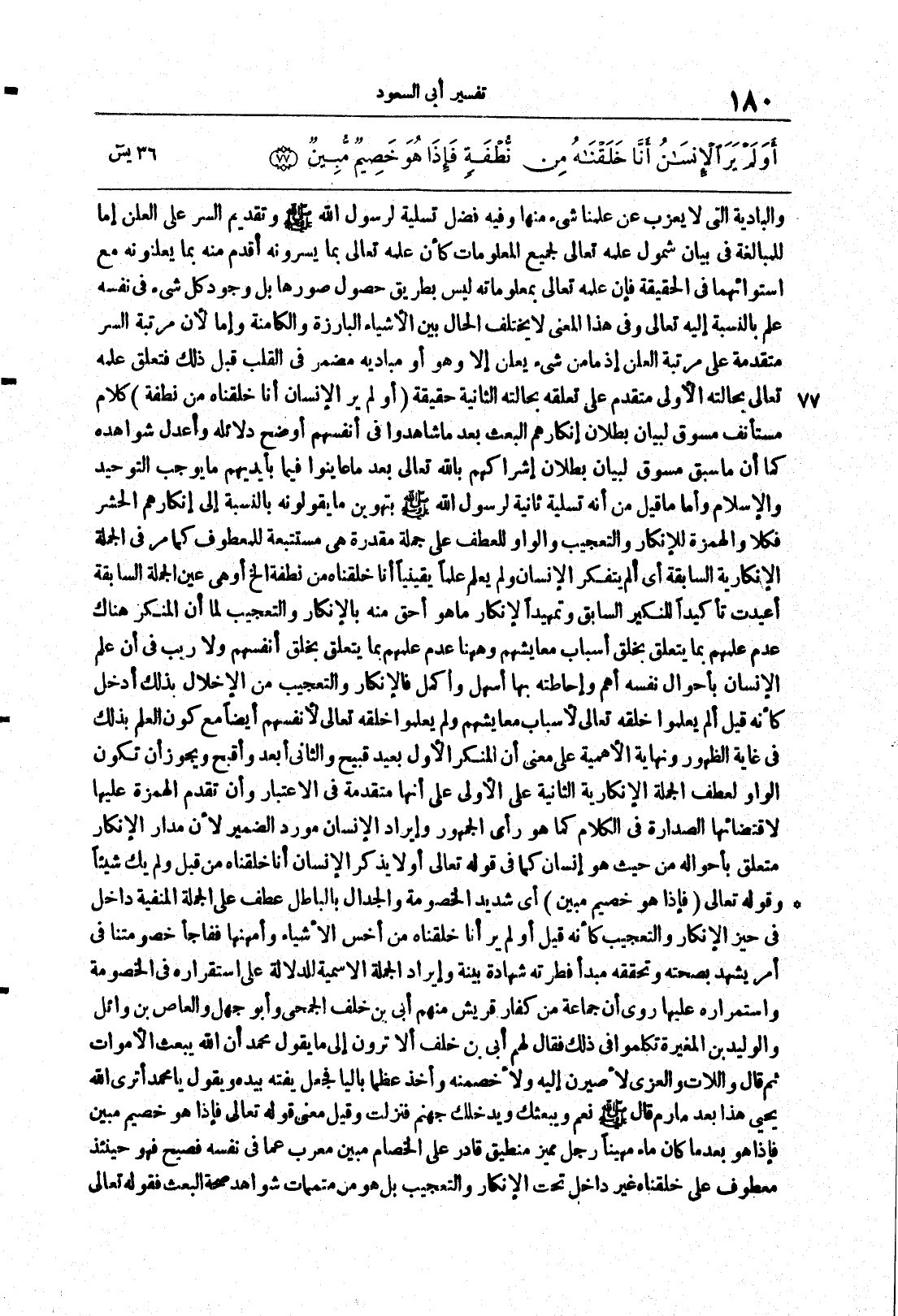 {أو لم يَرَ الإنسان أَنَّا خلقناه مِن نُّطْفَةٍ} كلامٌ مستأنفٌ مسوقٌ لبيانِ بطلانِ إنكارِهم البعثِ بعد ما شاهدوا في أنفسِهم أوضحَ دلائلهِ وأعدلَ شواهده كما أن ما سبق مسوق لبيان بطلانِ إشراكهم بالله تعالى بعد ما عاينُوا فيما بأيديهم ما يوجب التَّوحيدَ والإسلامَ وأما ما قيل من أنه تسليةٌ ثانيةٌ لرسولِ الله صلى الله عليه وسلم بتهوينِ ما يقولونَهُ بالنِّسبةِ إلى إنكارِهم الحشرَ فكَلاَّ والهمزةُ للإنكارِ والتَّعجيبِ والواوُ للعطفِ عَلى جملةٍ مقدَّرةٍ هي مستتبعة للمعطوفِ كما مرَّ في الجملة الإنكارية السابقةِ أي ألم يتفكر الإنسانُ ولم يعلم علماً يقينياً أنا خلقناهُ من نطفةٍ الخ أو هي عين الجملة السابقةِ أعيدتْ تأكيداً للنكيرِ السَّابقِ وتمهيداً لإنكارِ ما هو أحقُّ منه بالإنكارِ والتَّعجيبِ لما أنَّ المنكرَ هناك عدمُ علمهم بما يتعلق بخلق اسباب معايشهم وههنا عدم علمهم بما يتعلق بخلقِ أنفسهم ولا ريبَ في أن علمَ الإنسانِ بأحوالِ نفسهِ أهمُّ وإحاطته بها أسهلُ وأكملُ فالإنكارُ والتَّعجيبُ من الإخلالِ بذلك أدخلُ كأنَّه قيل ألم يعلمُوا خلقَه تعالى لأسبابِ معايشهم ولم يعلمُوا خلقَه تعالى لأنفسِهم أيضاً مع كونِ العلمِ بذلك في غايةِ الظُّهور ونهايةِ الأهميةِ على معنى أنَّ المنكر الأول بعيدٌ قبيحٌ والثاني أبعدُ وأقبحُ ويجوزُ أنْ تكونَ الواوُ لعطفِ الجملةِ الإنكاريَّةِ الثَّانيةِ على الأُولى على أنَّها متقدِّمة في الاعتبارِ وأنَّ تقدمَ الهمزةِ عليها لاقتضائها الصَّدارة في الكلامِ كما هو رأيُ الجمهورِ وإيرادُ الإنسانِ موردَ الضَّميرِ لأنَّ مدارَ الإنكارِ متعلِّقٌ بأحوالهِ من حيثُ هو إنسانٌ كما في قولِه تعالى أَوْ لاَ يَذْكُرُ إلإنسان أَنَّا خَلَقْنَاهُ من قبل ولم يك شَيْئاً وقولُه تعالى {فَإِذَا هُوَ خَصِيمٌ مُّبِينٌ} أي شديدُ الخُصومةِ والجدالِ بالباطلِ عطفٌ على الجملةِ المنفيَّةِ داخل في حيز الإنكار والتَّعجيبِ كأنَّه قيل أولم يَرَ أنَّا خلقناهُ من أخسِّ الأشياءِ وأمهنِها ففاجأ خصومتنا في أمرٍ يشهدُ بصحَّتهِ وتحقُّقهِ مبدأُ فطرته شهادةً بيِّنةً وإيرادُ الجملةِ الاسميةِ للدِّلالةِ على استقرارِه في الخُصومةِ واستمرارِه عليها رُوي أنَّ جماعةً من كفَّارِ قُريشٍ منهم أُبيَّ بنَ خلفٍ الجُمَحي وأبُو جهلٍ والعاصِ بنُ وائلٍ والوليدُ بنُ المغيرة تكلَّموا في ذلكَ فقال لهم أبيُّ بنُ خلفٍ ألا ترون إلى ما يقولُ محمدٌ إنَّ اللَّهَ يبعثُ الأمواتَ ثم قال واللاَّتِ والعُزَّى لأَصيرنَّ إليه ولأخصِمنَّه وأخذ عظماً بالياً فجعل يفتُّه بيدِه ويقولُ يا محمَّدُ أترى الله يُحيي هذا بعد مارم قال صلى الله عليه وسلم نعم ويبعثُك ويُدخلكَ جهنَّم فنزلتْ وقيل معنى قولَه تعالى فَإِذَا هُوَ خَصِيمٌ مُّبِينٌ فإذا هُو بعدما كانَ ماءً مَهيناً رجلٌ مميِّزٌ منطيقٌ قادرٌ على الخصامِ مبينٌ مُعرِبٌ عمَّا في نفسِه فصيحٌ فهو حينئذ معطوف على خلقناه غيرُ داخلٍ تحت الإنكار والتَّعجيبِ بل هو من مُتمَّماتِ شواهدِ صحَّةِ البعثِ فقوله تعالى