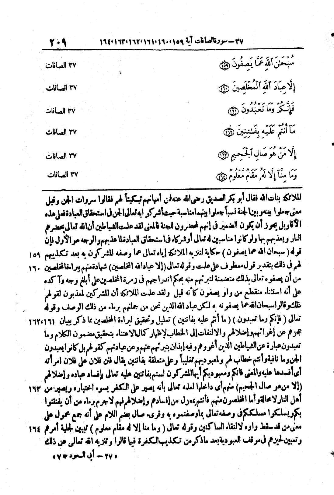 الصافات 159 164 الملائكةُ بناتُ الله فقال ابو بكرٍ الصدِّيقِ رضيَ الله عنه فمنْ أمهاتهم تبكيتاً لهمُ فقالوا سَرَواتُ الجنِّ وقيل معنى جعلُوا بينه وبين الجِنَّةِ نَسَباً جعلُوا بينهما مناسبةً حيثُ أشركُوا به تعالى الجن في استحقاق العبادةِ فعلى هذه الأقاويلِ يجوزُ أنْ يكونَ الضَّميرُ في إنَّهم لمحضرون للجنَّة فالمَعنى لقد علمتِ الشَّياطينُ أنَّ الله تعالى يحضرهم النَّارَ ويُعذبهم بها ولو كانُوا مناسبينَ له تعالى أو شركاء في استحقاق العبادةِ لمَّا عذَّبهم والوجهُ هو الأوَّلُ فإنَّ قوله