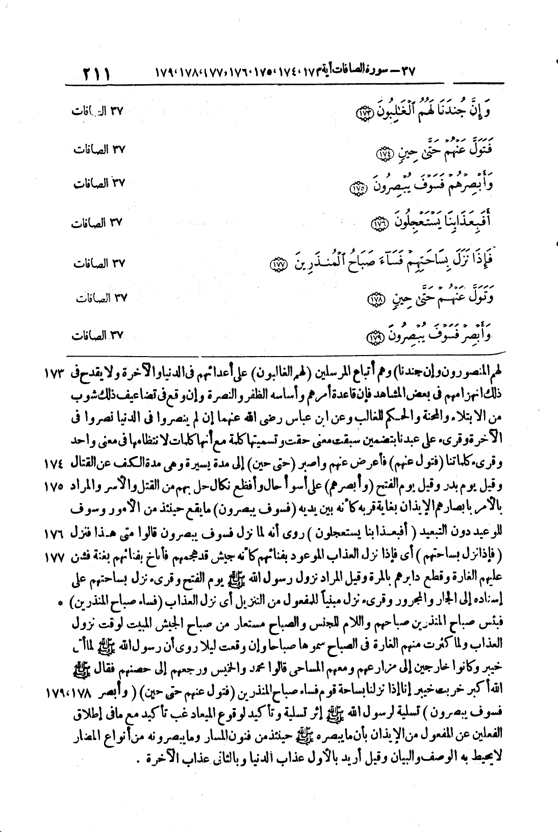 {فَإِذَا نَزَلَ بِسَاحَتِهِمْ} أي فإذا نزلَ العذابُ الموعودُ بفنائِهم كأنَّه جيشٌ قد هجمَهم فأناخَ بفنائِهم بغتةً فشنَّ عليهم الغارةَ وقطعَ دابرَهم بالمرَّةِ وقيل المرادُ نزول رسول الله صلى الله عليه وسلم يوم الفتح وقرئ نزلَ بساحتهم على إسنادِه الى الجار والمجرور وقرئ نُزّل مبنَّياً للمفعولِ من التَّنزيلِ أي نُزّلَ العذابُ {فَسَاء صَبَاحُ المنذرين} فبئسَ صباحُ المنذَرين صباحُهم واللاَّمُ للجنسِ والصَّباحُ مستعارٌ من صباحِ الجيشِ المبيِّتِ لوقت نزول العذابِ ولمَّا كثُرتْ منهم الغارة في الصَّباح سمَّوها صباحاً وإن وقعت ليلاً رُوي أنَّ رسولَ الله صلى الله عليه وسلم لمَّا أتى خيبرَ وكانُوا خارجينَ إلى مزارعِهم ومعهم المَسَاحي قالُوا محمدٌ والخميسُ ورجعهم الى حصنهم فقال صلى الله عليه وسلم الله أكبرُ خربتْ خيبرُ إنا إذَا نزلنا بساحةِ قومٍ فساءَ صباحُ المنذَرينِ