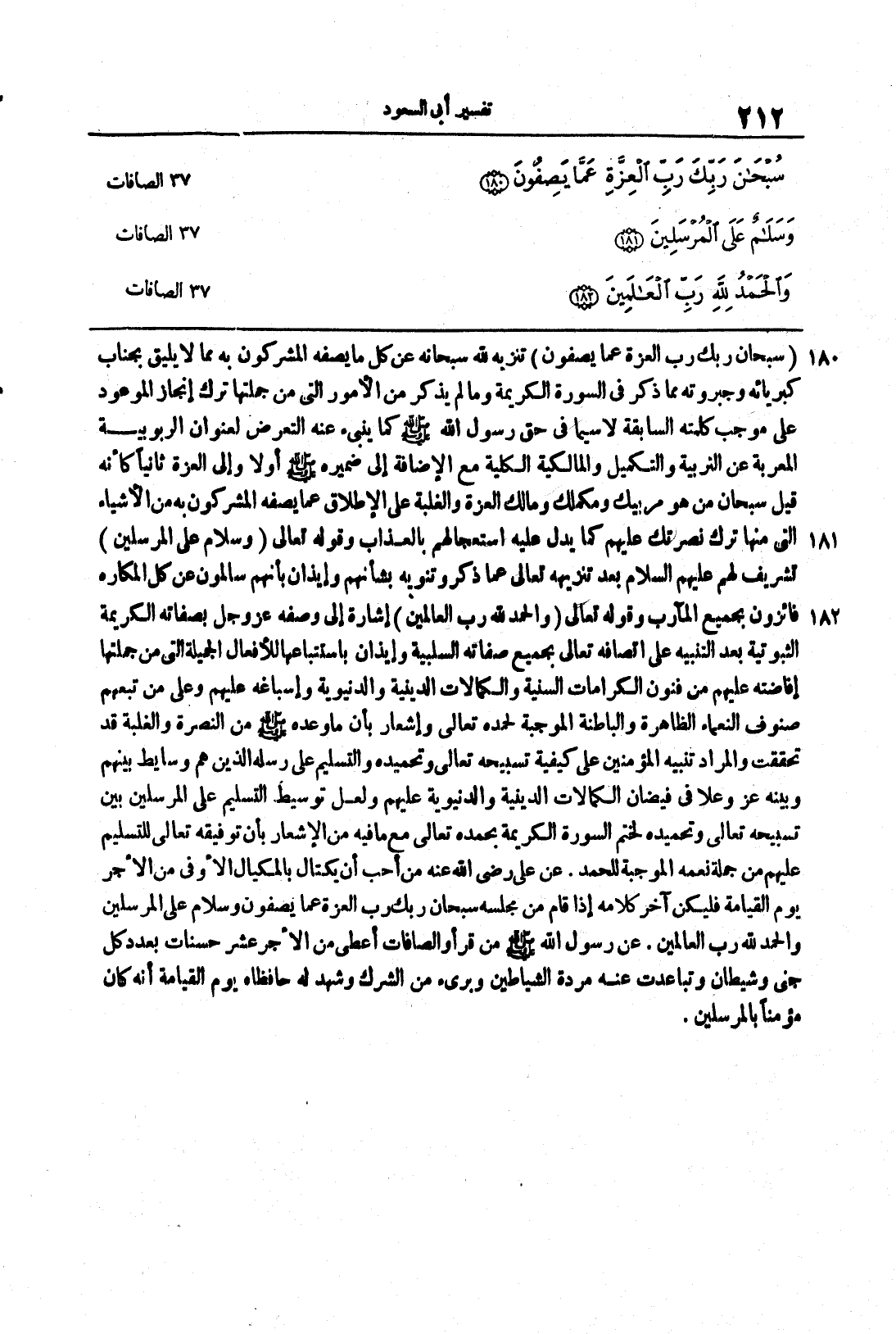 {والحمد للَّهِ رَبّ العالمين} إشارةٌ إلى وصفِه عزَّ وجلَّ بصفاتِه الكريمةِ الثُّبوتيةِ بعد التَّنبيهِ على اتِّصافِه تعالى بجميعِ صفاته السَّلبيةِ وإيذانٌ باستتباعِها للأفعالِ الجميلةِ التي من جُملتها إفاضتُه عليهم من فُنُونِ الكراماتِ السنيةِ والكمالاتِ الدِّينيَّةِ والدُّنيويَّةِ وإسباغه عليهم وعلى مَن تبعِهم صُنوف النَّعماءِ الظَّاهرةِ والباطنةِ المُوجبةِ لحمده تعالى وإشعارٌ بأن ما وعده صلى الله عليه وسلم من النُّصرةِ والغَلَبة قد تحقَّقتْ والمرادُ تنبيه المؤمنينَ على كيفيَّةِ تسبيحِه تعالى وتحميدِه والتَّسليم على رُسلِه الذين هم وسايط بينهم وبينَهُ عزَّ وعَلاَ في فيضانِ الكَمالاتِ الدِّينيَّةِ والدُّنيويَّةِ عليهم ولعلَّ توسيطَ التَّسليمِ على المُرسلينَ بين تسبيحهِ تعالى وتحميدِه لختمِ السُّورةِ الكريمةِ بحمدِه تعالى مع ما فيه من الإشعارِ بأنَّ توفيقَهُ تعالى للتَّسليمُ عليهم من جُملةِ المُوجبةِ للحمدِ عن عليَ رضيَ الله عنه من أحبَّ أنْ يُكتالَ بالمكيالِ الأَوْفى من الأجرِ يومَ القيامةِ فليكُن آخرُ كلامِه إذا قامَ من مجلسهِ سبحان رَبّكَ رَبّ العزة عمَّا يصفُون وسلامٌ على المُرسلينَ والحمدُ للَّهِ رَبّ العالمين عن رسول الله صلى الله عليهِ وسلَّم مَنْ قرأَ الصآفات أُعطِيَ من الأجر عشرَ حَسَناتٍ بعددِ كلِّ جنيَ وشيطان وتباعدت منه مَرَدةُ الشَّياطينِ وبرىءَ مِنَ الشِّركِ وشَهد له حافظاهُ يومَ القيامةِ أنَّه كانَ مُؤمناً بالمُرسلين