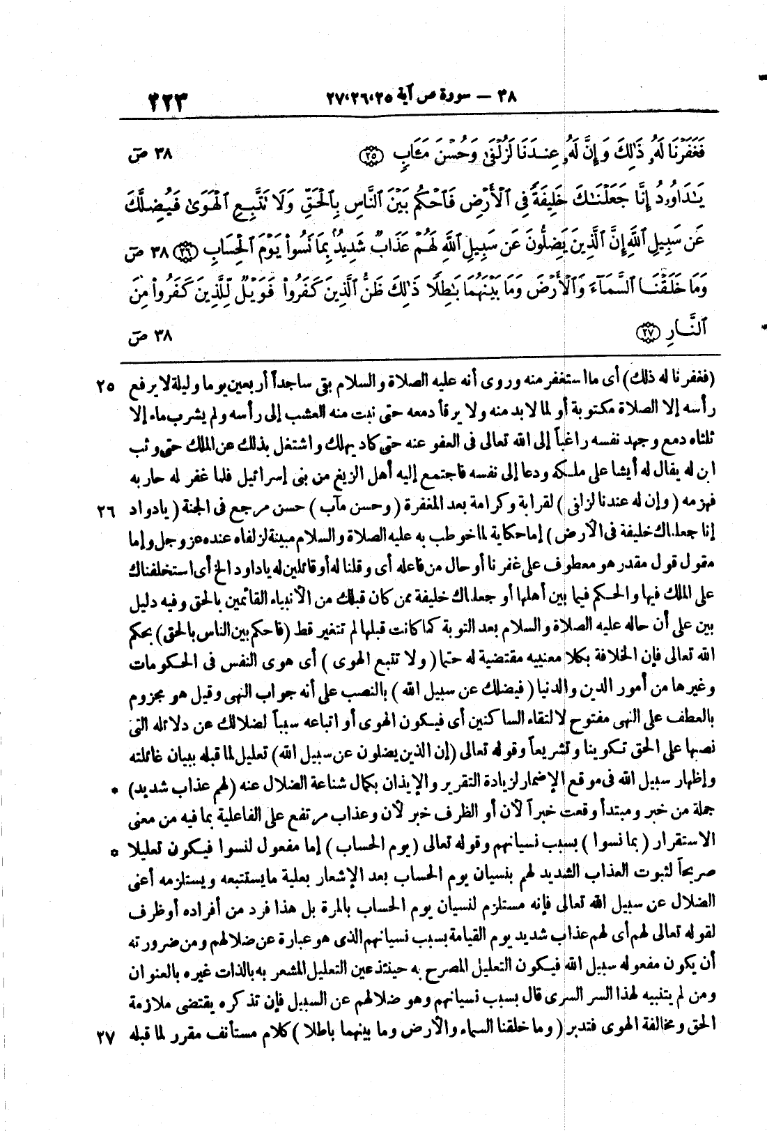 {يا داود إِنَّا جعلناك خَلِيفَةً فِى الارض} إمَّا حكاية لمَّا خُوطب به عليه الصَّلاةُ والسَّلامُ مبينة لزُلفاه عنده عزَّ وجلَّ وإمَّا مقولُ قولٍ مقدَّرٍ هو معطوف على غفرنا أو حالٌ من فاعلِه أي وقُلنا له أو قائلين له يا داودُ الخ أي استخلفناك على المُلك فيها والحكمِ فيما بينَ أهِلها أو جعلناك خليفةً ممَّن كان قبلك من الأنبياء القائمينَ بالحقِّ وفيه دليلٌ بيِّنٌ على أنَّ حالهَ عليهِ الصَّلاة والسَّلام بعد التَّوبةِ كما كانت قبلها لم تتغيَّرْ قَط {فاحكم بَيْنَ الناس بالحق} بحكم الله تعالى فإنَّ الخلافةَ بكلا معنييه مقتضيةٌ له حتماً {وَلاَ تَتَّبِعِ الهوى} أي هوى النفس في الحكومات وغيرها من أمور الدين والدنيا {فَيُضِلَّكَ عَن سَبِيلِ الله} بالنصب على أنه جواب النَّهي وقيل هو مجزومٌ بالعطفِ على النَّهيِ مفتوحٌ لالتقاء السَّاكنينِ أي فيكون الهوى أو اتِّباعُه سبباً لضلالِك عن دلائله التي نصها على الحقِّ تكويناً وتَشريعاً وقوله تعالى {إِنَّ الذين يَضِلُّونَ عَن سَبِيلِ الله} تعليلٌ لما قبله ببيانِ غائلتِه وإظهار سبيلِ الله في موقع الإضمار لزيادة التَّقريرِ والإيذانِ بكمال شناعةِ الضَّلالِ عنه {لَهُمْ عَذَابٌ شَدِيدٌ} جملة من خبرٍ ومبتدأٍ وقعتْ خبراً لأنَّ أوْ الظرف خبر لأنَّ وعذابٌ مرتفع على الفاعلية بمَا فيهِ من مَعْنى الاستقرارِ {بِمَا نَسُواْ} بسبب نسيانِهم وقوله تعالى {يَوْمِ الحساب} إما مفعولٌ لنسُوا فيكون تعليلاً صريحاً لثبوت العذابِ الشَّديدِ لهم بنسيان يوم الحسابِ بعد الإشعارِ بعلِّيةِ ما يستتبُعه ويستلزمه أعني الضَّلالَ عن سبيل الله تعالى فإنَّه مستلزمٌ لنسيانِ يوم الحساب بالمرَّةِ بل هذا فردٌ من أفرادِه أو ظرفٌ لقولِهِ تَعَالى لَهُمْ أي لهُم عذابٌ شديدٌ يومَ القيامةِ بسببِ نسيانِهم الذي هو عبارةٌ عن ضلالِهم ومن ضرورته أن يكون مفعولُه سبيلِ الله فيكون التَّعليلُ المصرح به حينئذٍ عينَ التَّعليلِ المشعر به بالذَّاتِ غيره بالعُنوان ومَن لم يتنبيه لهذا السرِّ السريِّ قال بسبب نسيانِهم وهو ضلالُهم عن السَّبيلِ فإنَّ تذكَّره يقتضي ملازمةَ الحقِّ ومخالفةَ الهَوَى فتدبَّر