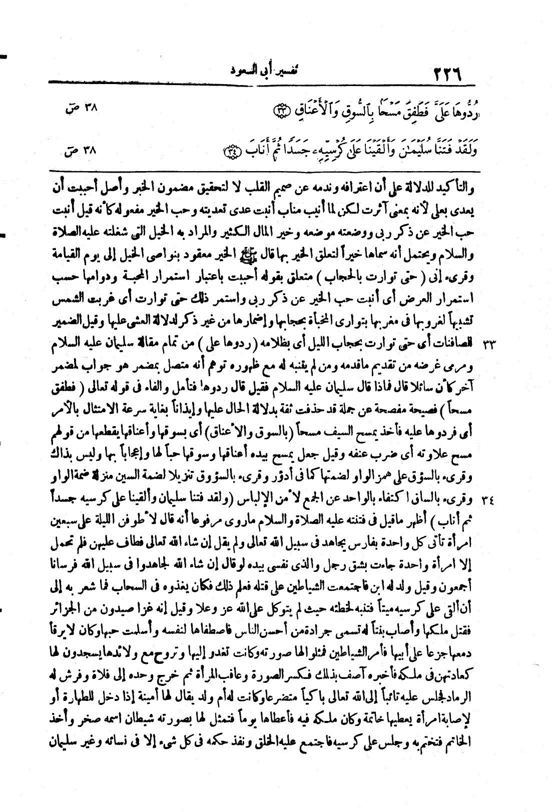 ص 33 34 والتَّأكيدُ للدِّلالةِ على أنَّ اعترافَه وندمَهُ عن صميم القلبِ لا لتحقيقِ مضمونِ الخبر وأصلُ أحببتُ أنْ يعدَّى بعلى لانه بمعنى آثرت لكن لما أُنيب مُنابَ أنبتُ عُدِّي تعديتَه وحبَّ الخير مفعوله كأنه قبل أنبتُ حبَّ الخيرِ عن ذكر ربِّي ووضعتُه موضعه وخير المالُ الكثيرُ والمراد به الخيلُ التي شغلته عليه الصَّلاةُ والسَّلامُ ويحتمل أنَّه سمَّاها خيراً لتعلُّق الخيرِ بها قال صلى الله عليه وسلم الخيرُ معقودٌ بنواصِي الخيلِ إلى يوم القيامة وقرىء أنِّي {حتى تَوَارَتْ بالحجاب} متعلِّق بقوله أحببتُ باعتبار استمرار المحبَّةِ ودوامِها حسب استمرارِ العرضِ أي أنبتُ حب الخير عن ذكر ربِّي واستمرَّ ذلك حتَّى توارتْ أي غربتْ الشَّمسُ تشبيهاً لغروبِها في مغربِها بتوارى المخبأةِ بحجابها وإضمارها من غير ذكر لدلالة العشي عليها وقيل الضمير للصافنات أي حتى توارتْ بحجابِ اللَّيلِ أي بظلامِه