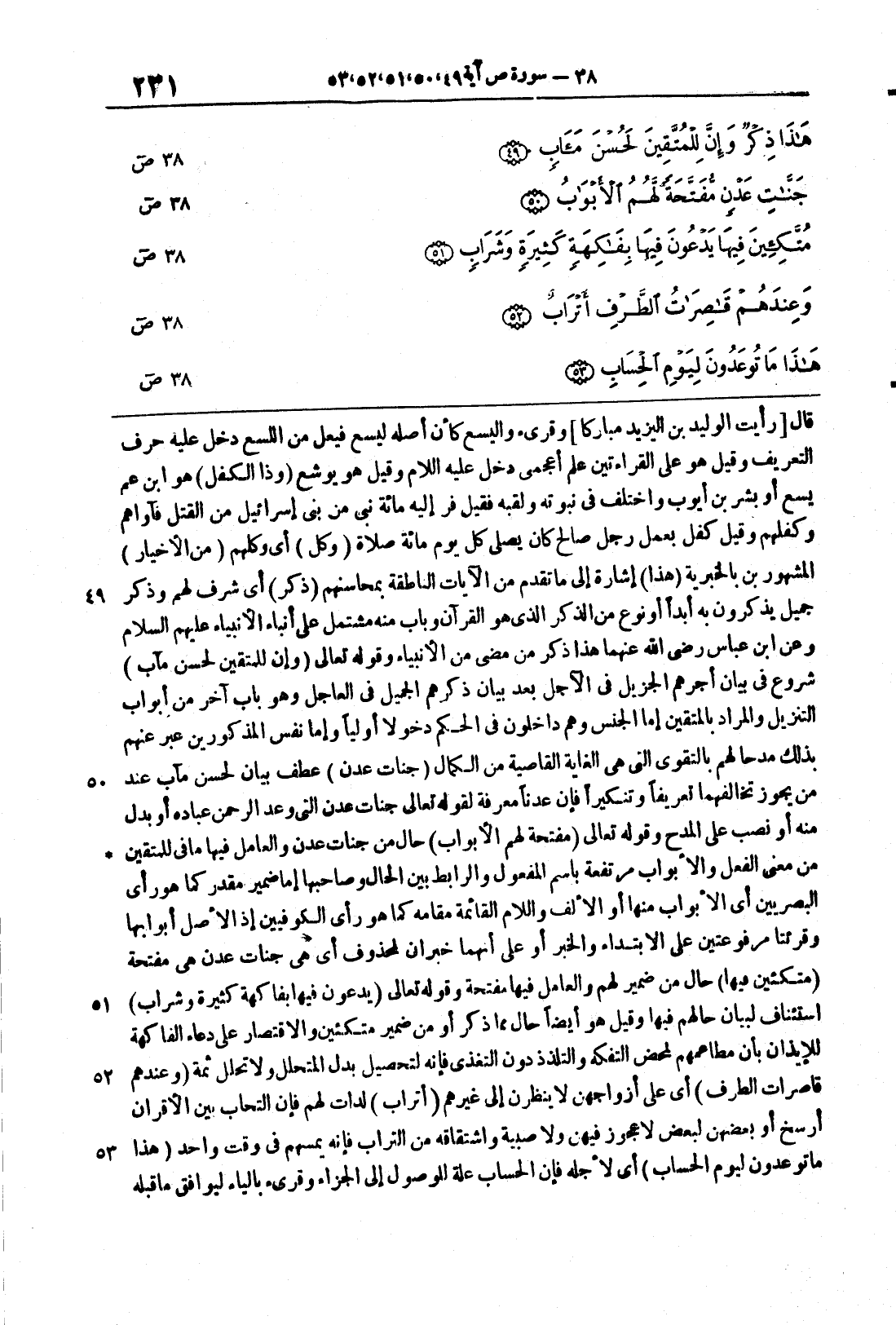 ص 49 53 قال رأيتُ الوليدَ بنَ اليزيد مباركا وقرئ واليسع كأنه أصله لَيْسع فَيْعل من اللَّسعِ دخلَ عليه حرفُ التَّعريفِ وقيل هو على القراءتينِ عَلَم أعجميٌّ دخل عليه اللامُ وقيل هو يُوشع {وَذَا الكفل} هو ابنُ عمِّ يسع أو بشر بن أيوب واختُلف في نبوَّتِه ولقبهِ فقيل فرَّ إليه مائةُ نبيَ من بني إسرائيلَ من القتل فآواهُم وكَفَلهم وقيل كُفل بعملِ رجلٍ صالحٍ كان يُصلِّي كلَّ يومٍ مائةَ صلاة {وَكُلٌّ} أي وكلهم {من الأخيار} المشهور بن بالخبرية