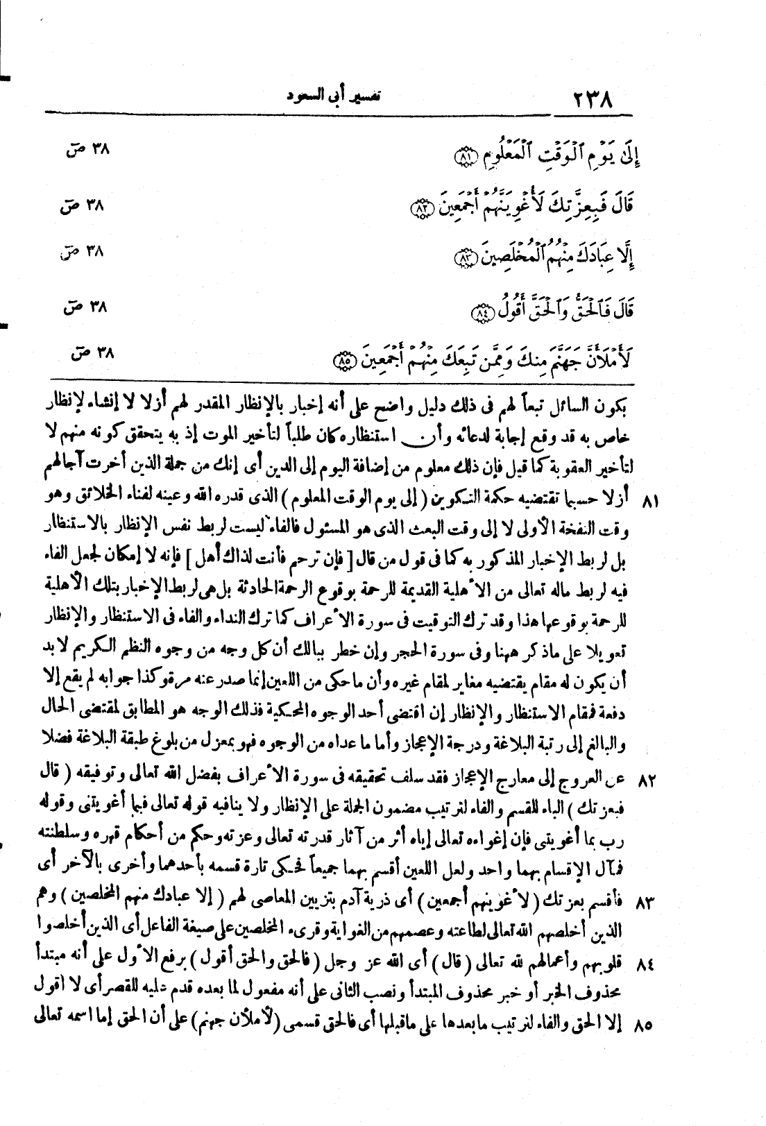 ص 81 85 بكونِ السائلِ تبعاً لهم في ذلك دليلٌ واضحٌ على أنَّه إخبارٌ بالإنظارِ المقدَّر لهم أزلاً لا إنشاءٌ لإنظارٍ خاصَ به قد وقعَ إجابةً لدعائِه وأنَّ استنظارَه كان طَلَباً لتأخيرِ الموتِ إذ بهِ يتحقّقُ كونُه منهم لا لتأخيرِ العُقوبةِ كما قيل فإنَّ ذلكَ معلومٌ من إضافةِ اليَّومِ إلى الدِّينِ أي إنَّك من جُملةِ الذينَ أخِّرتْ آجالُهم أزلاً حسبما تقتضيِه حكمةُ التَّكوينِ