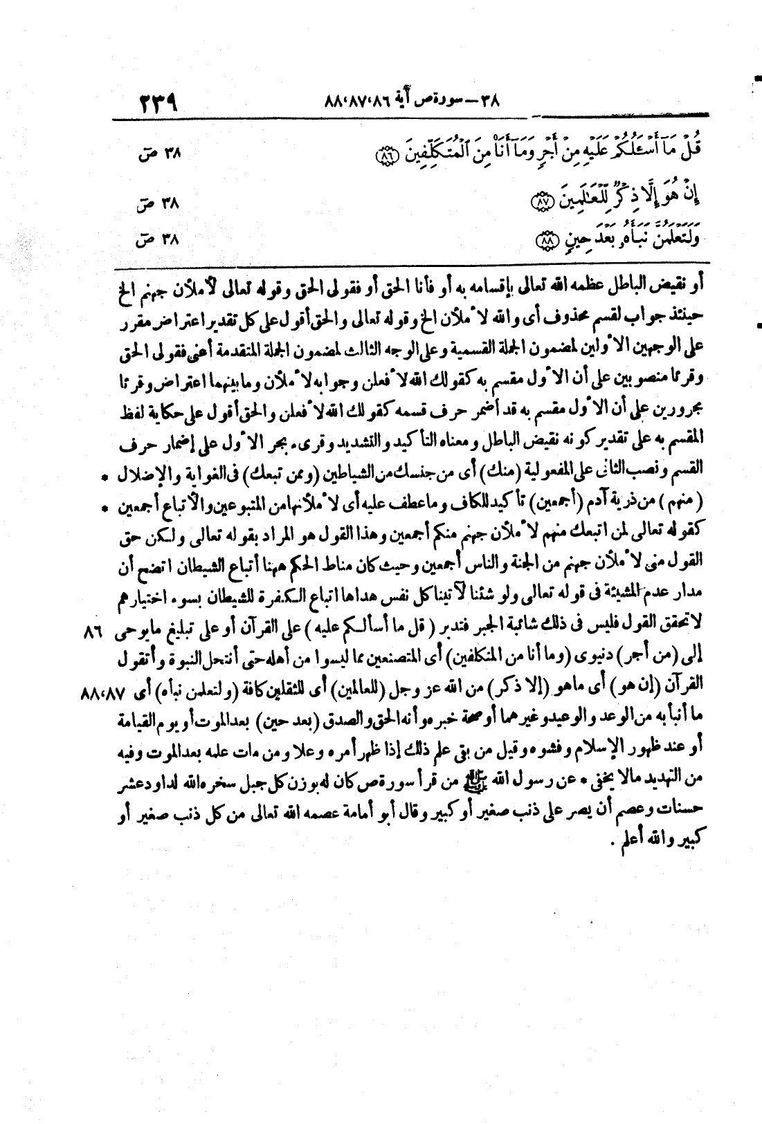 ص 86 88 أو نقيضُ الباطلِ عظّمه الله تعالى بإقسامِه به أو فأنا الحقُّ أو فقولِي الحقُّ وقوله تعالى لأَمْلاَنَّ جَهَنَّمَ الخ حينئذٍ جوابٌ لقسمٍ محذوفٍ أي والله لأملأنَّ الخ وقوله تعالى والحق أَقُولُ على كلِّ تقديرٍ اعتراضٌ مقرِّرٌ على الوجهينِ الأوَّلينِ لمضمونِ الجملةِ القَسَميَّةِ وعلى الوجِه الثَّالثِ لمضمونِ الجملةِ المتقدِّمةِ أعني فقولي الحقُّ وقُرئا منصوبينِ على أنَّ الأوَّلَ مقسمٌ به كقولِك الله لأفعلنَّ وجوابُه لأملأنَّ وما بينهما اعتراضٌ وقُرئا مجرورينِ على أن الأول مقسم به قد أُضمرَ حرفُ قسمِه كقولِك الله لأفعلنَّ والحقَّ أقولَ على حكايةِ لفظِ المقسمِ به على تقديرِ كونِه نقيضَ الباطلِ ومعناه التاكيد والتشديد وقرئ بجرِّ الأَولِ على إضمارِ حرفِ القسمِ ونصبِ الثَّانِي عل المفعوليَّةِ {مِنكَ} أي من جنسِك من الشَّياطينِ {وَمِمَّن تبعك} في الغواية والإضلال {منهم} ومن ذريةِ آدمَ {أَجْمَعِينَ} تأكيدٌ للكافِ وما عُطف عليه أي لأملأنَّها من المتبوعينَ والأتباعِ أجمعينَ كقولِه تعالى لمن اتبعك منهم لامْلانَّ جَهَنَّمَ مِنكُمْ أَجْمَعِينَ وهذا القولُ هو المرادُ بقوله تعالى ولكن حَقَّ القول مِنْى لاَمْلاَنَّ جَهَنَّمَ مِنَ الجنة والناس أَجْمَعِينَ وحيثُ كان مناطُ الحكمِ ههُنا اتِّباعُ الشَّيطانِ اتَّضحَ أنَّ مدارَ عدمِ المشيئةِ في قولِه تعالى وَلَوْ شِئْنَا لاَتَيْنَا كُلَّ نَفْسٍ هُدَاهَا اتباعُ الكَفَرةِ للشَّيطانِ بُسوءِ اختيارِهم لا تحقُّقُ القولِ فليس في ذلك شائبةُ الجبرِ فتدبَّر