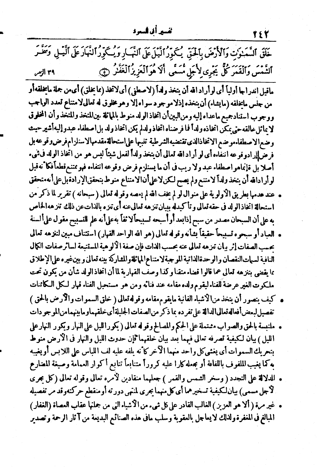 {خلق السماوات والارض بالحق} تفصيلٌ لبعض أفعاله تعالى الدالة على تفرُّدِه بما ذُكر من الصِّفاتِ الجليلة أي خلقهما وَمَا بَيْنَهُمَا من الموجودات ملتبِسة بالحقِّ والصَّوابِ مشتملة عل الحِكَم والمصالح وقولُه تعالى {يكور الليل عَلَى النهار وَيُكَوّرُ النهار على الليل} بيانٌ لكيفيَّةِ تصرُّفةِ تعالى فيهما بعد بيان خلقِهما فإنَّ حدوثَ اللَّيلِ والنَّهارِ في الأرض منوطٌ بتحريك السَّمواتِ أي يغشى كلُّ واحدٍ منُهما الآخَرَ كأنَّه يلفه عليه لفَّ اللباسِ على اللاَّبسِ أو يُغيبه به كما يُغيَّبُ الملفوفُ باللفامة أو يجعله كارَّاً عليه كُروراً متتابعاً تتابع أكوارِ العمامةِ وصيغةُ المضارع للدِّلالةِ على التَّجدُّدِ {وَسَخَّرَ الشمس والقمر} جعلهما منقادينِ لأمرِه تعالى وقولُه تعالى {كُلٌّ يَجْرِى لاِجَلٍ مُّسَمًّى} بيانٌ لكيفيَّةِ تسخيرِهما أي كلٌّ منهما يجري لمُنتهى دورتِه أو منقطعِ حركتِه وقد مرَّ تفصيلُه غيرَ مرَّةٍ {إِلاَّ هُوَ العزيز} الغالبُ القادر على كل شئ من الأشياء التي من جُملتها عقابُ العُصاةِ {الغفار} المبالغُ في المغفرةِ ولذلك لا يُعاجل بالعقوبةِ وسلب ما في هذه الصَّنائعِ البديعة من آثارِ الرَّحمةِ وتصدير
