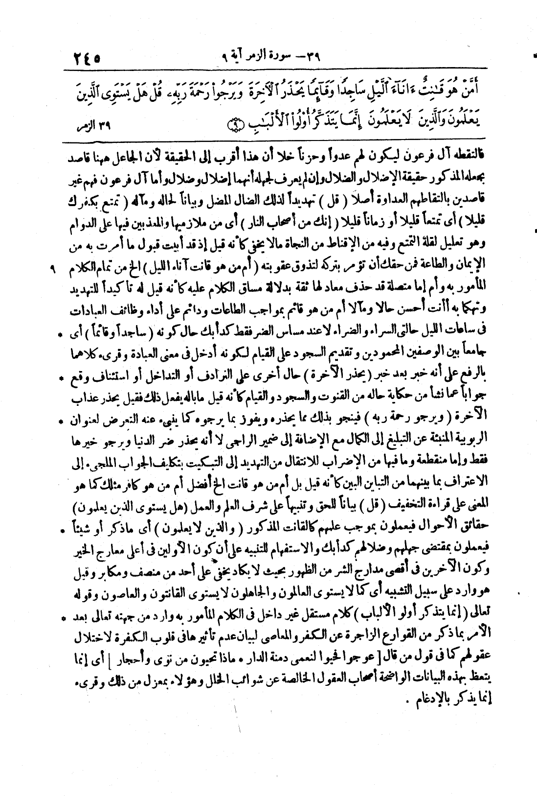 الزمر 9 فالتقطَه آلُ فرعونَ لِيَكُونَ لَهُمْ عَدُوّاً وَحَزَناً خلا أنَّ هذا أقربُ إلى الحقيقةِ لأنَّ الجاعلَ ههنا قاصدٌ بجعله المذكورِ حقيقةَ الإضلالِ والضَّلالِ وإنْ لم يعرف لجهله أنَّهما إضلالٌ وضلالٌ وأمَّا آلُ فرعونَ فهم غيرُ قاصدين بالتقاطِهم العداوةَ أصلاً {قُلْ} تهديداً لذلك الضَّالَّ المُضلَّ وبياناً لحالِه ومآلِه {تَمَتَّعْ بِكُفْرِكَ قَلِيلاً} أي تمتُّعاً قليلاً أو زمَاناً قليلاً {إِنَّكَ من أصحاب النار} أي من ملازميها والمعذَّبين فيها على الدَّوامِ وهو تعليلٌ لقلَّة التَّمتعِ وفيه من الإقناط من النَّجاةِ ما لا يخفى كأنَّه قيل إذ قد أبيتَ قبولَ ما أُمرت به من الإيمان والطَّاعةِ فمن حقَّك أنْ تُؤمرَ بتركه لتذوقَ عقوبتَه